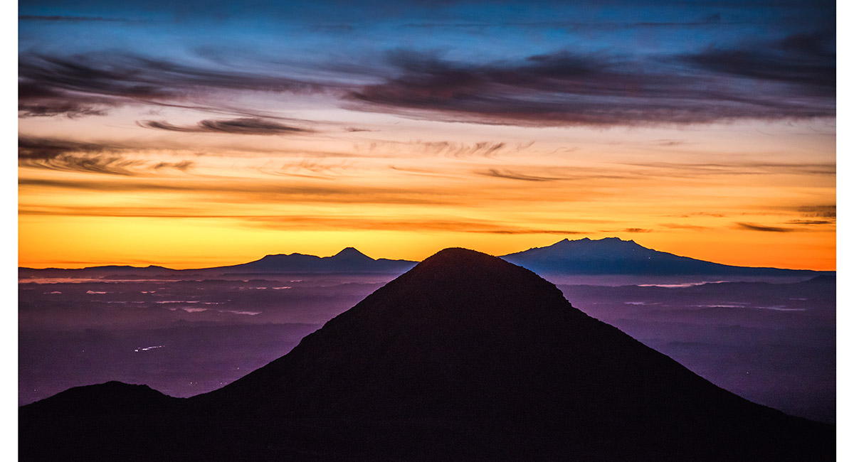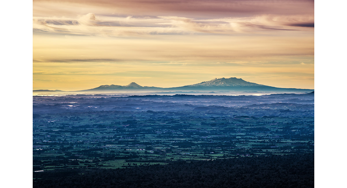Dawn view east to Tongariro National Park, from 1,200m, above Pouakai Hut
