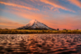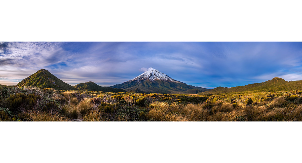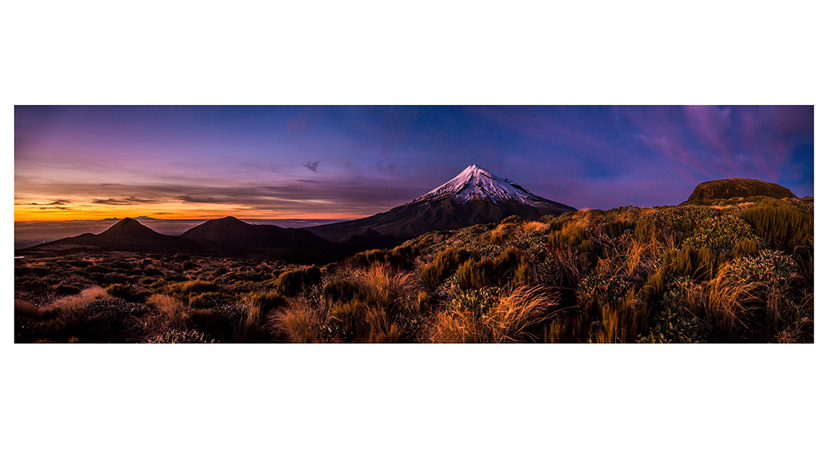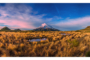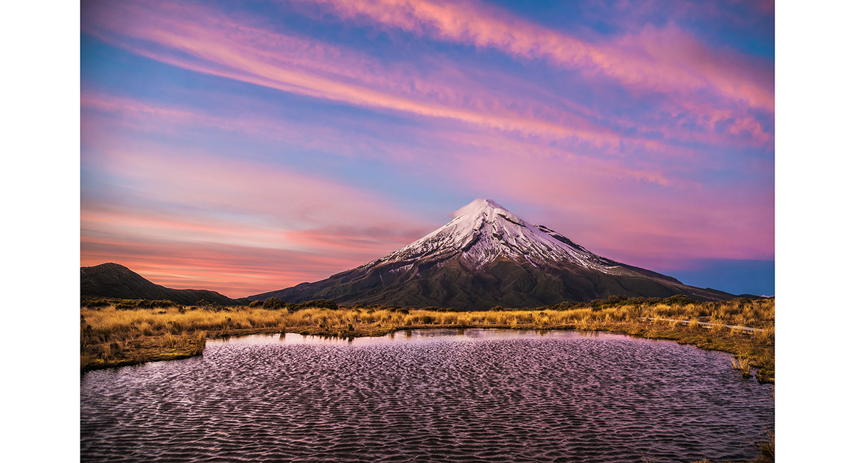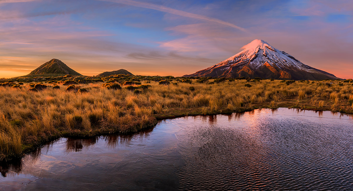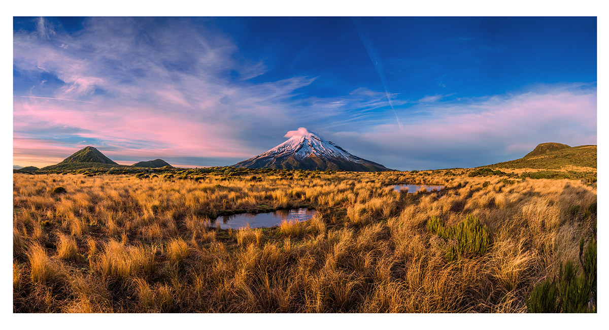 Dawn view south east to Mount Taranaki, across the Pouakai Track tarns