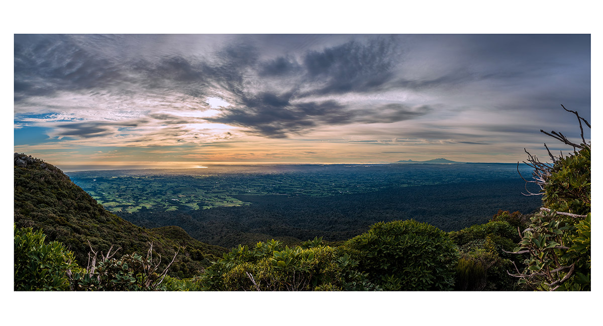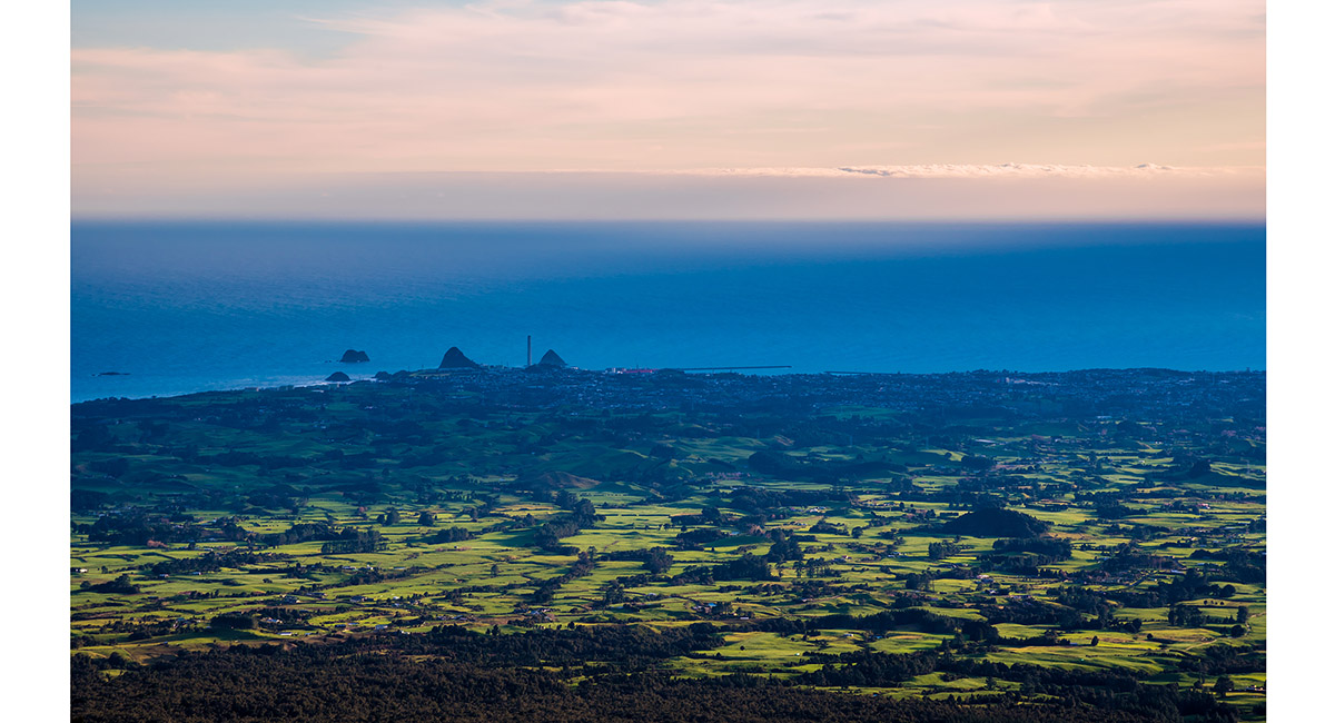 Dawn view north to New Plymouth, from 1,200m, above Pouakai Hut