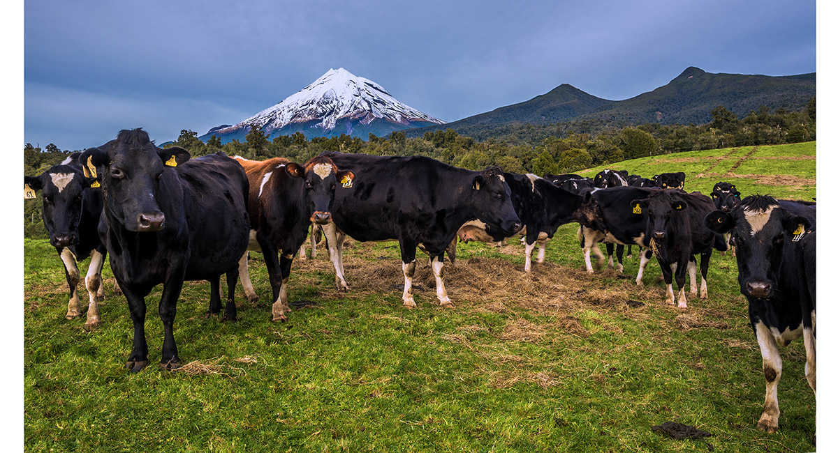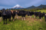 Pouakai girls with Mount Taranaki and Pouakais, on the farm access to Maude Track