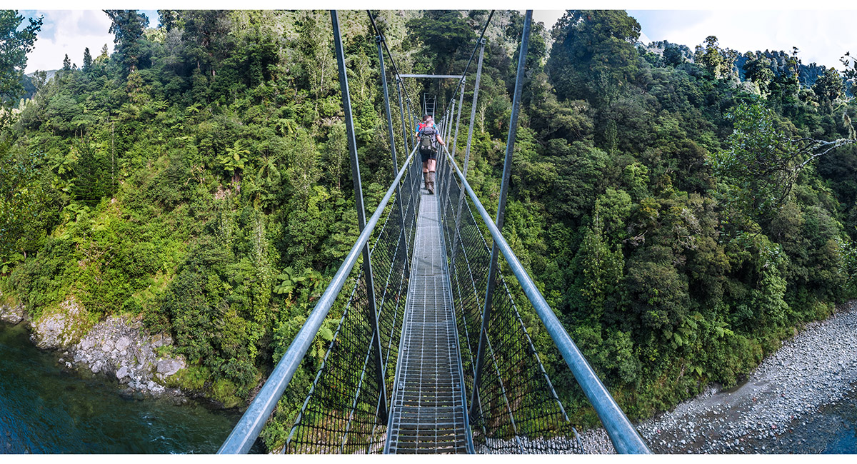 Crossing the huge swing bridge spanning the Waiohine River, just beyond the Waiohine Camp ground (170m)