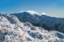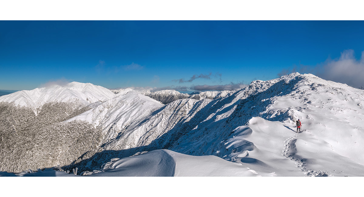 A winter view of the Tararua Ranges near Jumbo. From left - Holdsworth, the main range in the distance, Jumbo (left of centre), Angle Knob, McGregor, Broken Axe Pinnacles, and the Three Kings