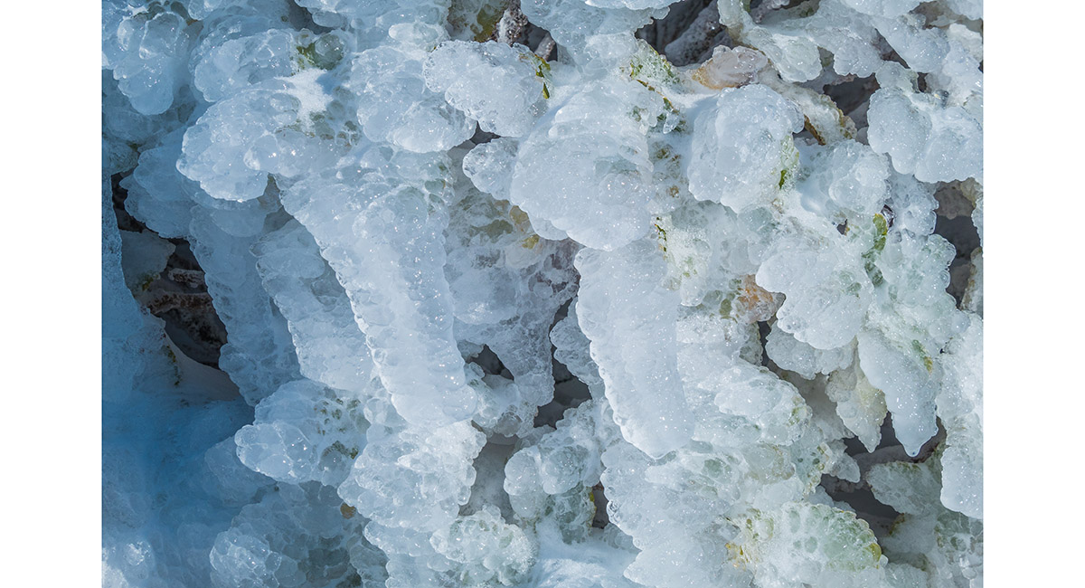Ice patterns on the inside of the fire exit door of Jumbo Hut
