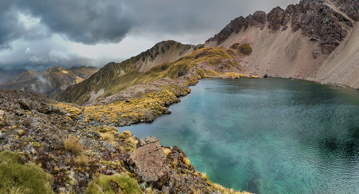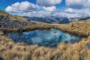 A view back across tussock wetlands at 1,300m to Mt McCabe at right and Mt Princess left