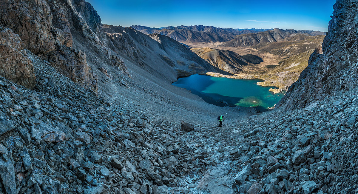 Dropping to Princess Bath. The scree slope giving access to the southeast ridge of Mt Princess is above the right side of the tarn