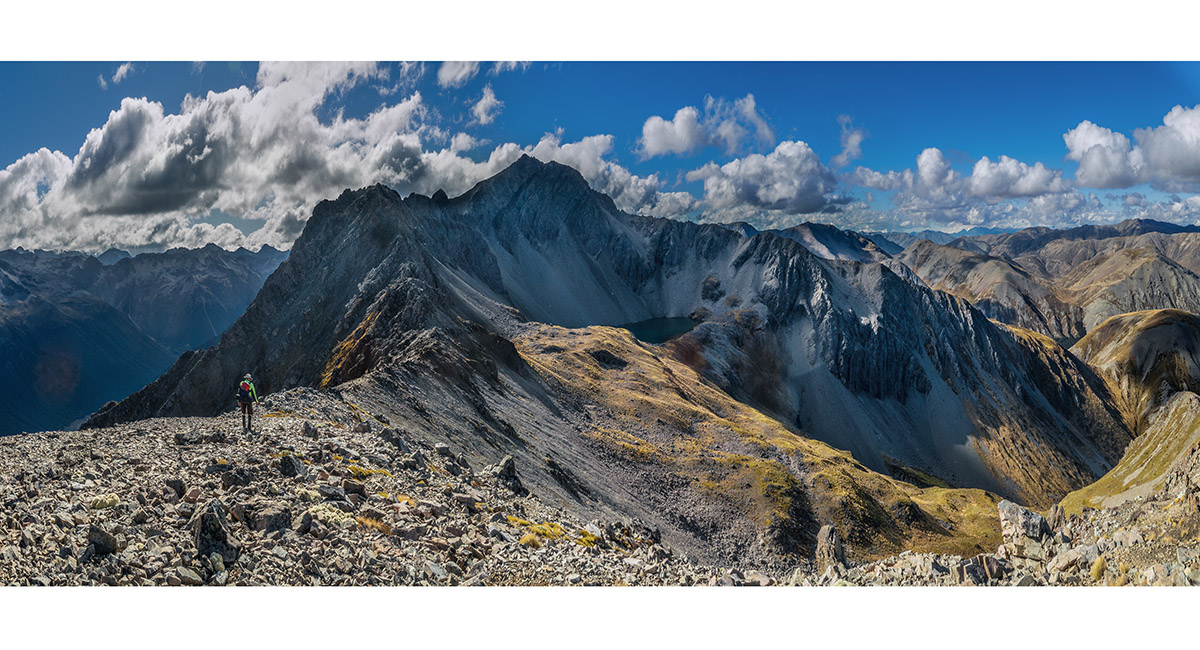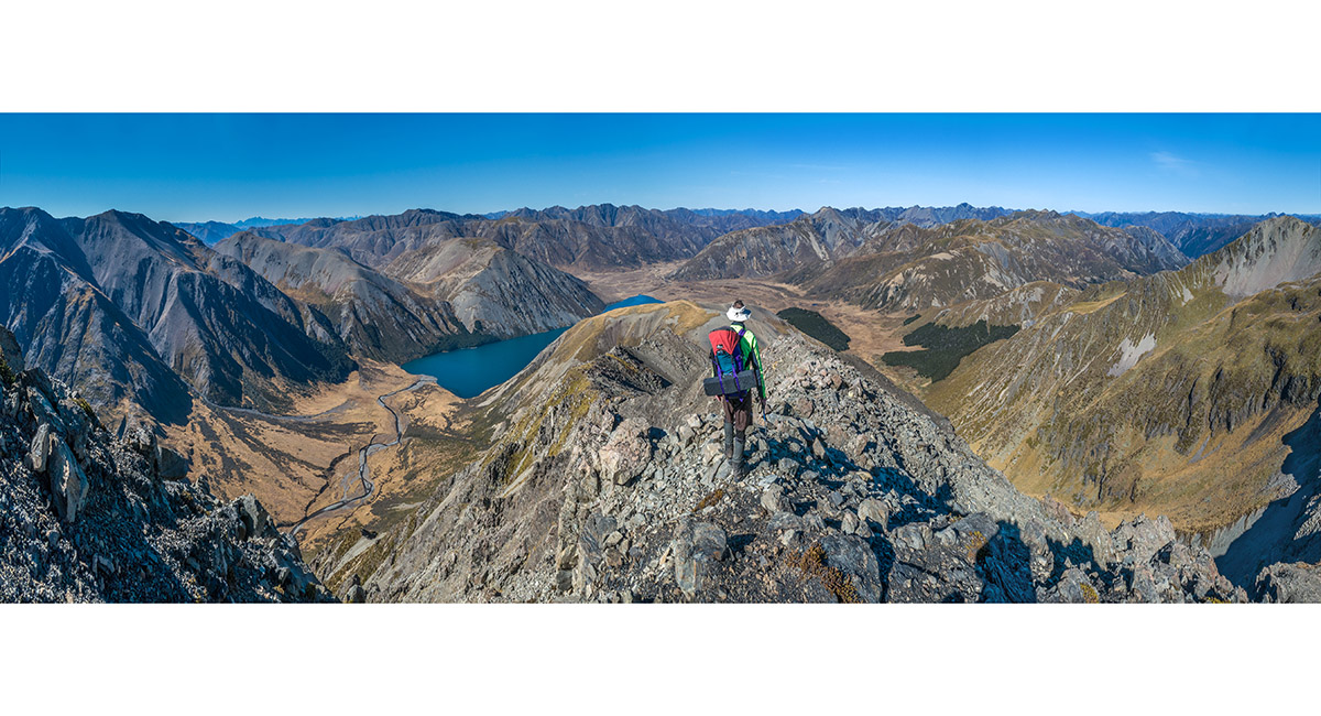 Mt Princess (2,126m) summit view south, with the southeast ridge (ascent) at left and southwest ridge (descent) right. Mt McCabe (1,606m) and Lake Tennyson (1,102m) are top left. This picture takes in almost the entire circuit beginning and ending at Maling Pass