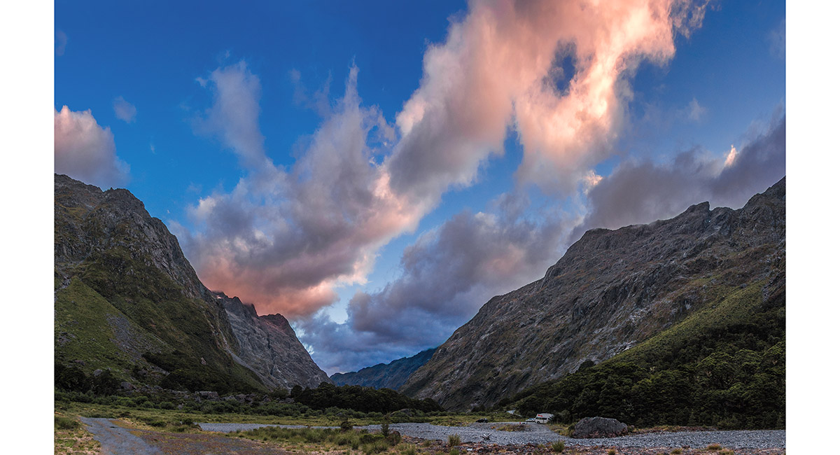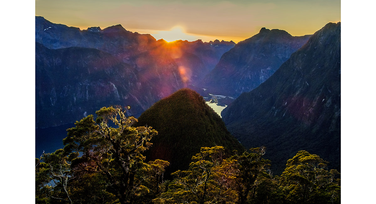 Dawn from just above the tree line, looking back to Milford Sound. Up we went again now that the wind had dropped overnight