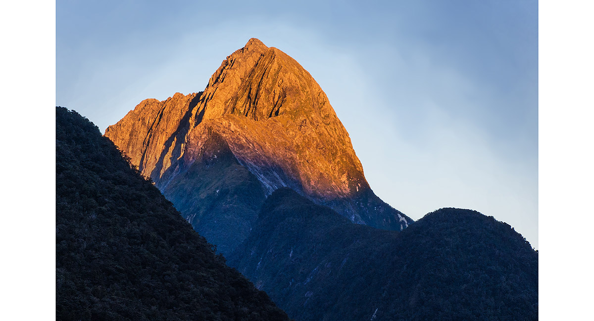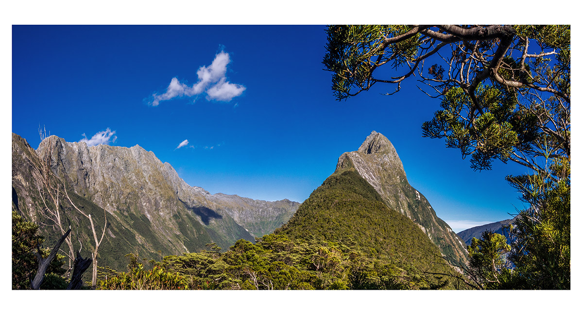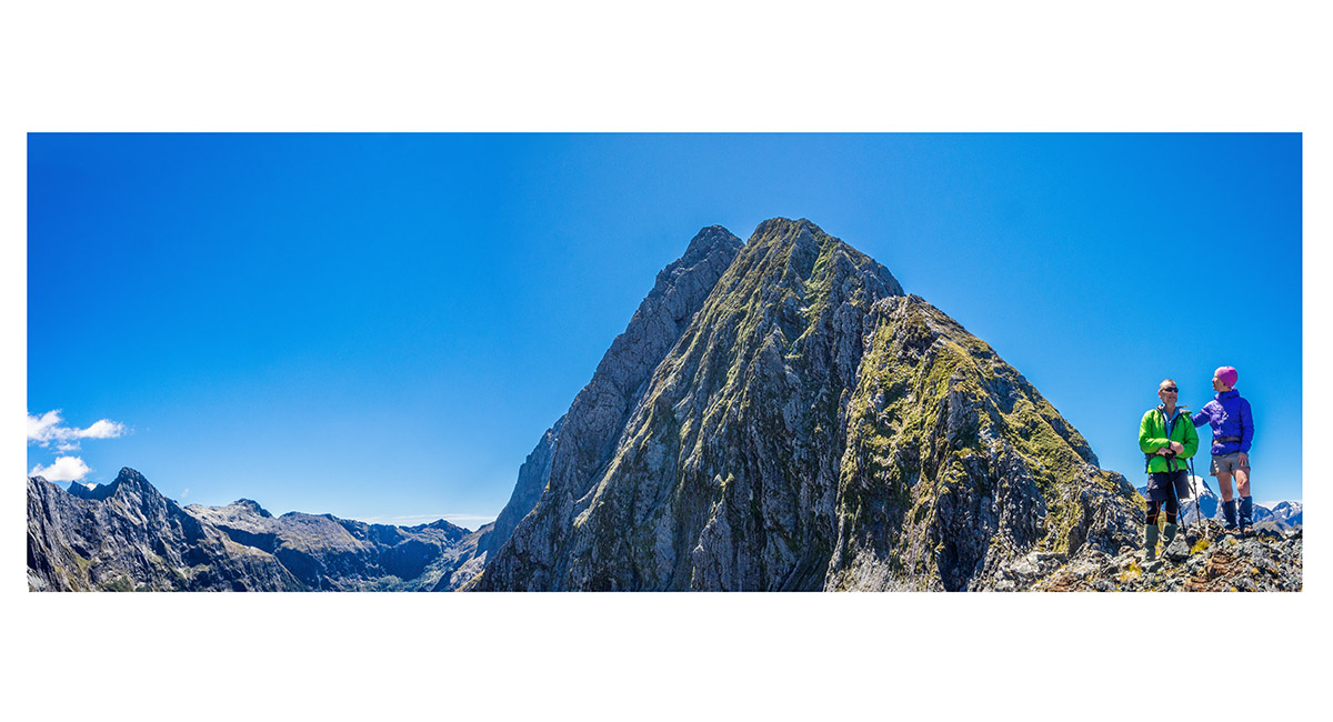 Our first good view of the upper section of Mitre Peak from the Footstool (835m)