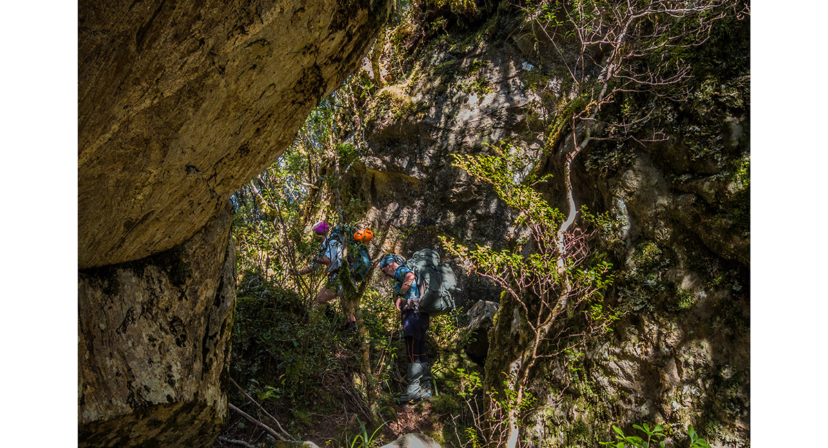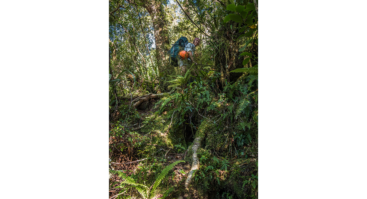Climbing often near vertical bush on the first steep section up to the 541m point