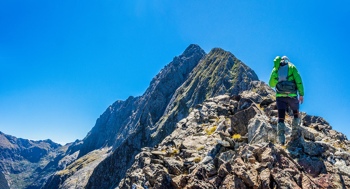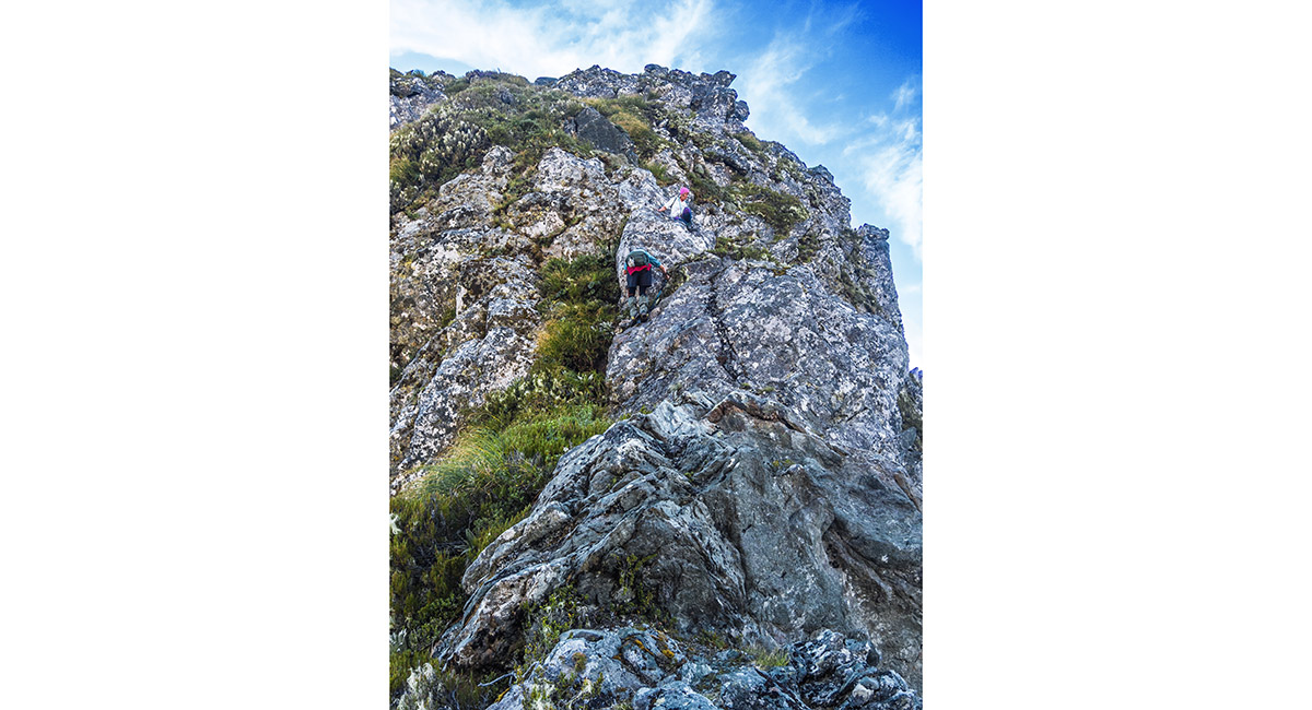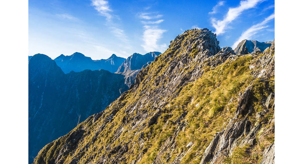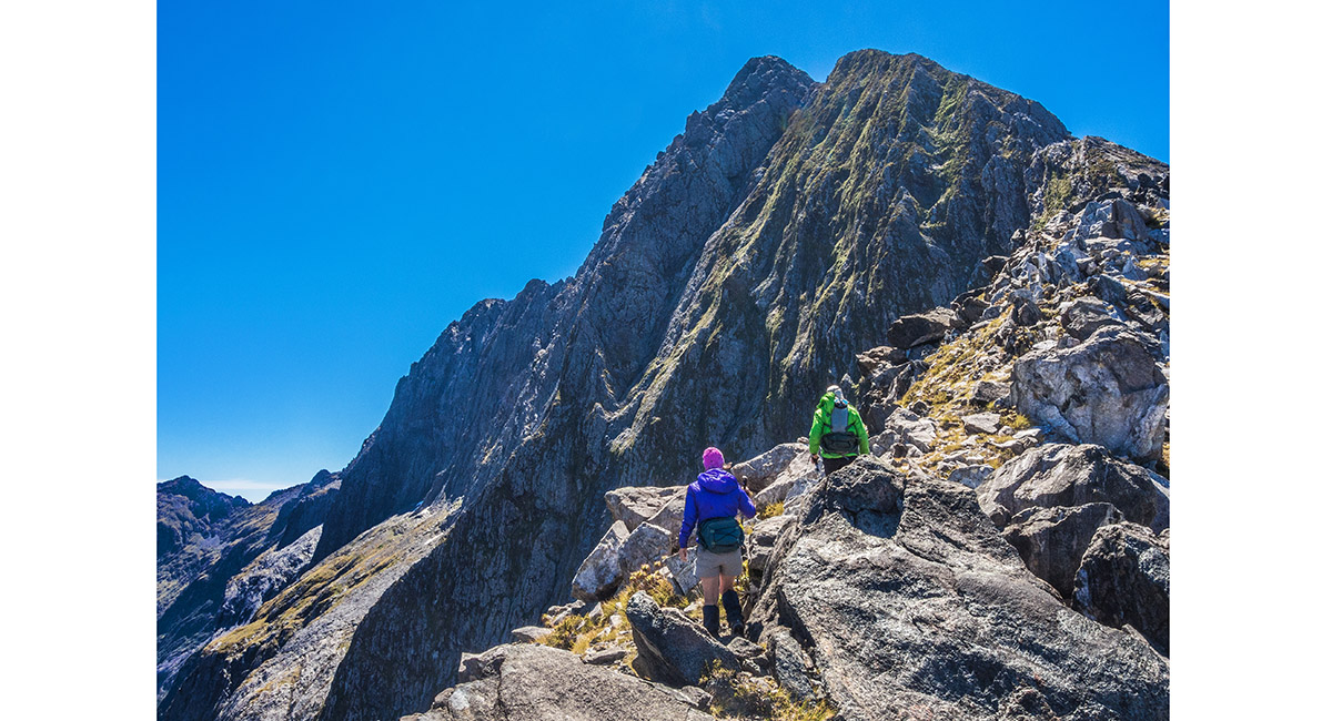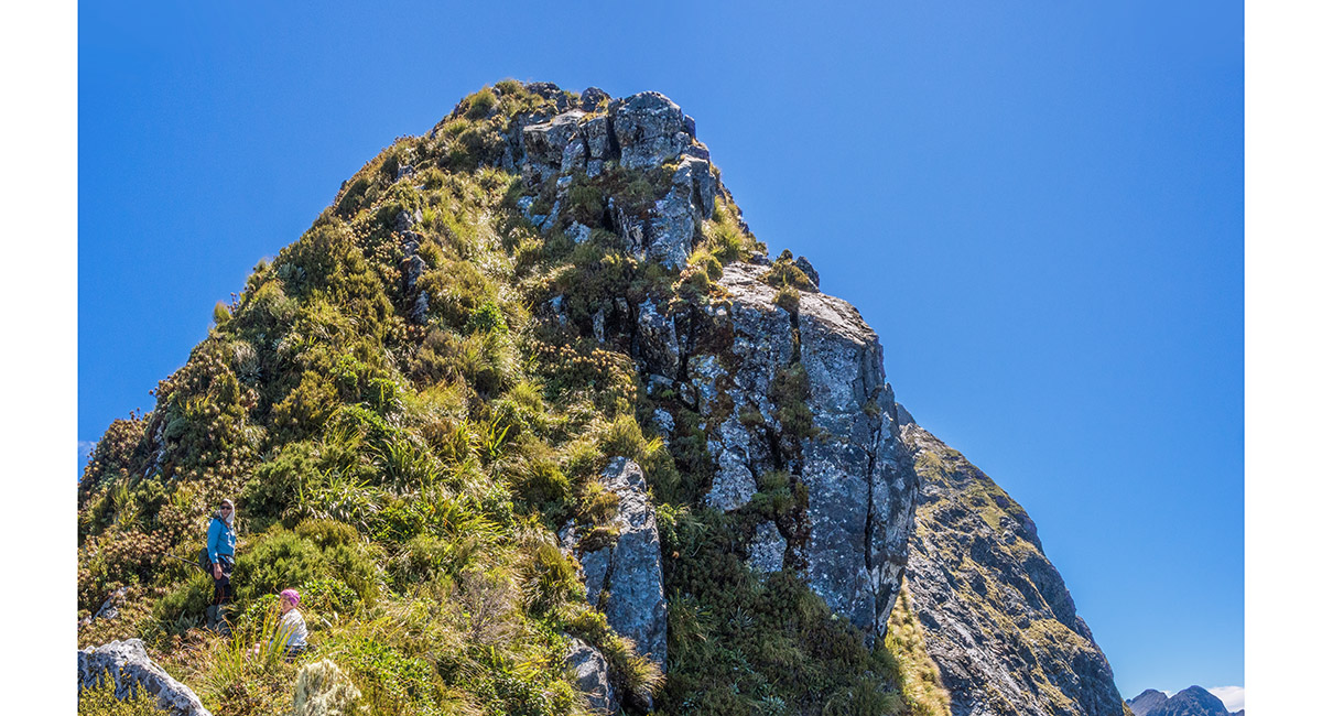 The view back down Mitre Peak's knife edged ridge from our high point at 1,430m