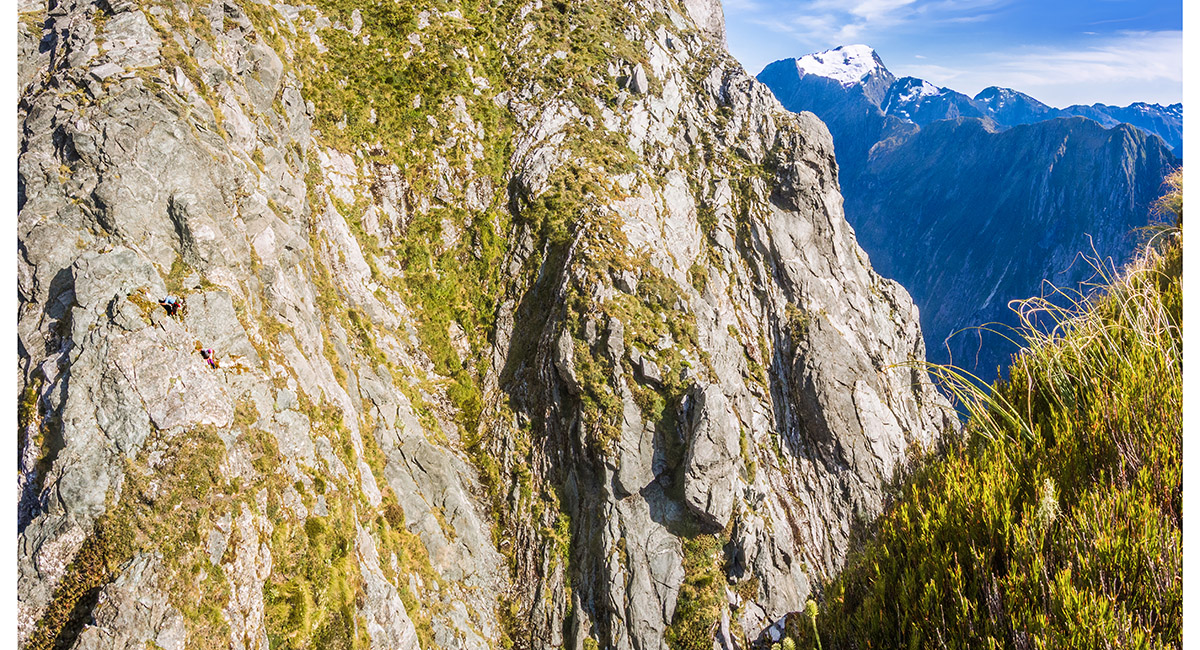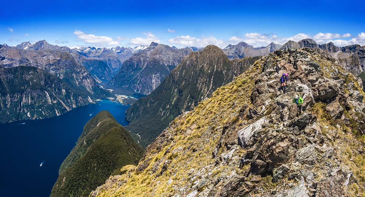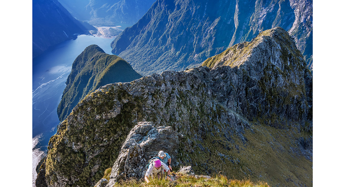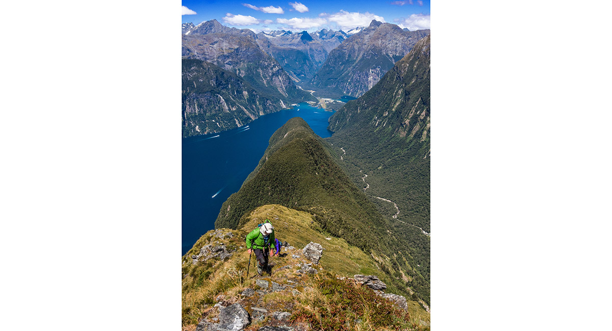 At the base of the horizontal section, looking back down the ridge to Milford Sound