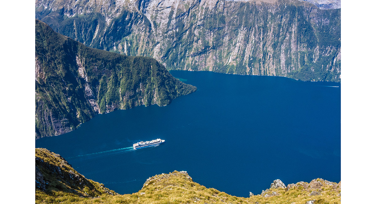 Over a vertical kilometre below a gigantic cruise ship looks like a bath tub toy