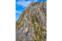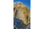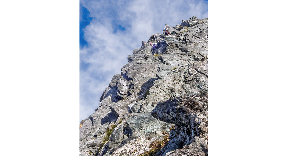 Looking down from the east side of the notch, with the crux of the upper section of Mitre Peak stretching upwards on the far side