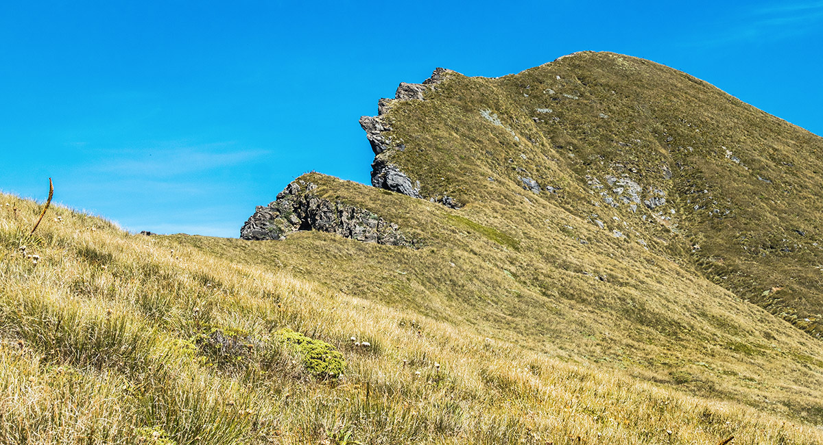 The west side of the 1,720m high point is more gradually sloping open tussock, leading back up to the third high point - 1,745m, just north of North Twin