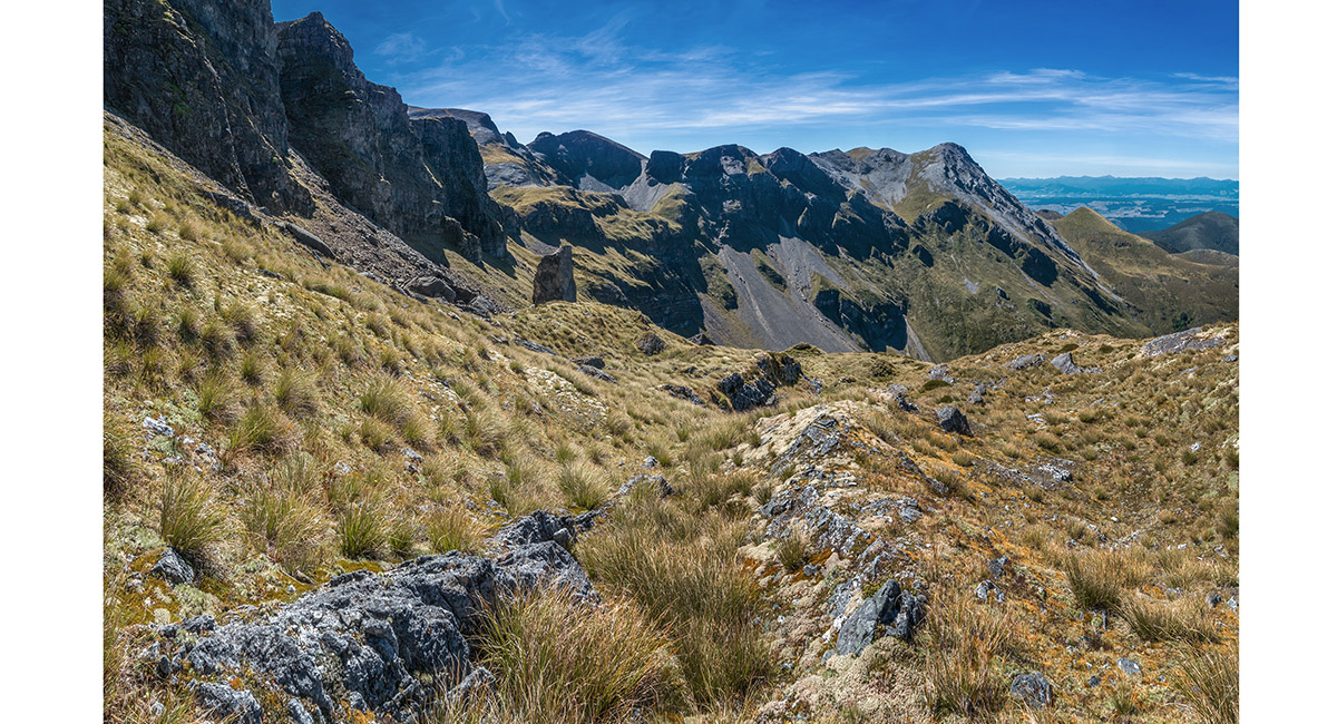 Looking southwest along the tops I would mostly traverse, from 1,700m on the south side of Mt Arthur. The first highpoint here - Pt 1753, is cut off by a deep gut on the western end, so I climbed this last on my return