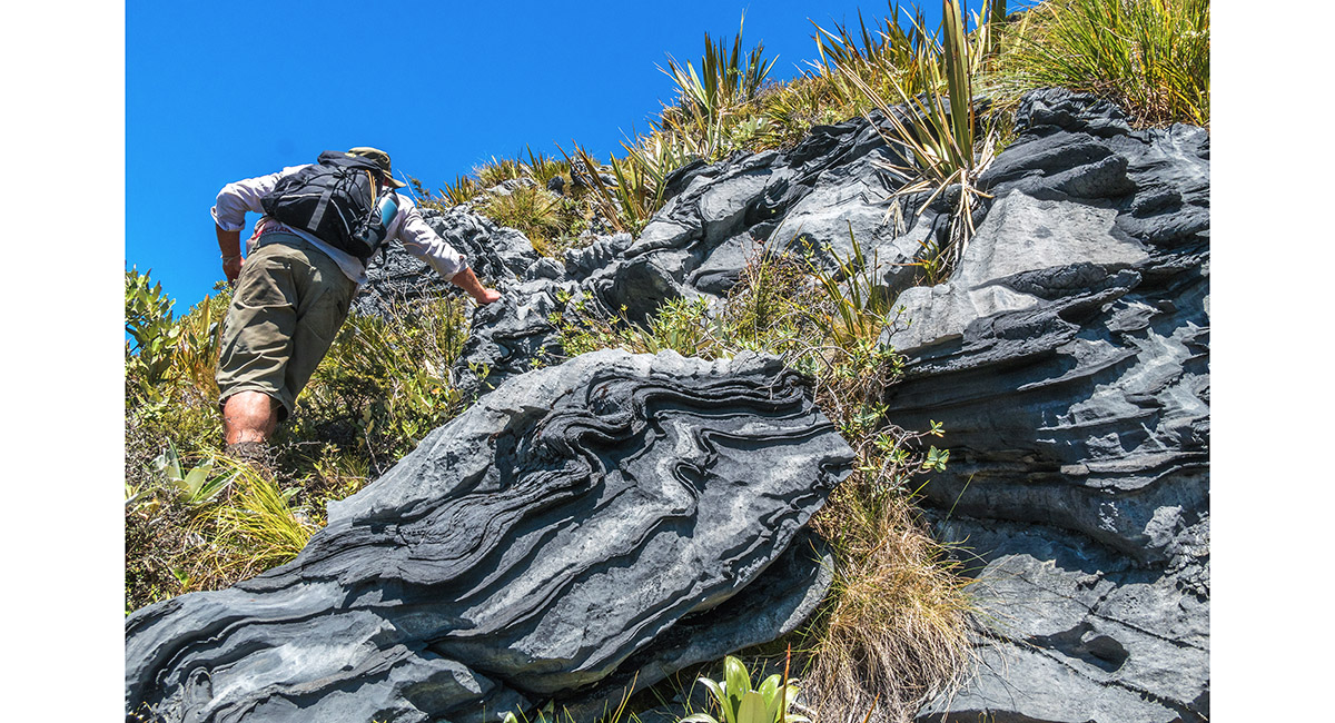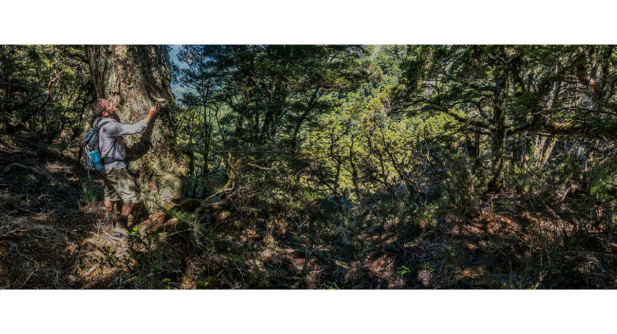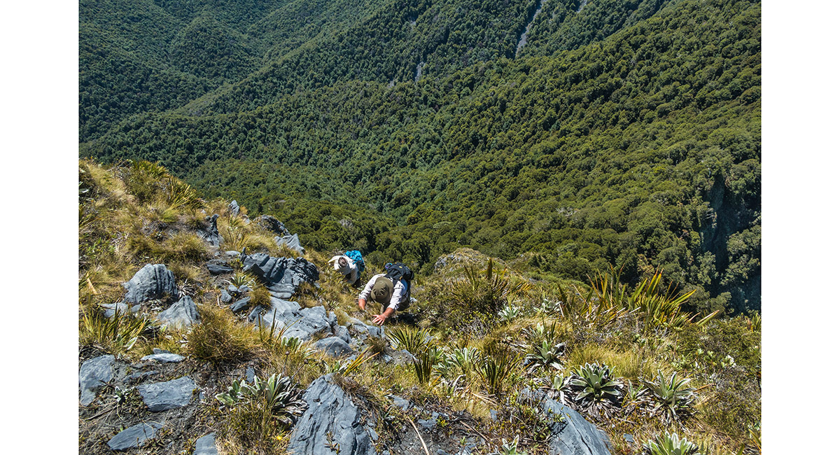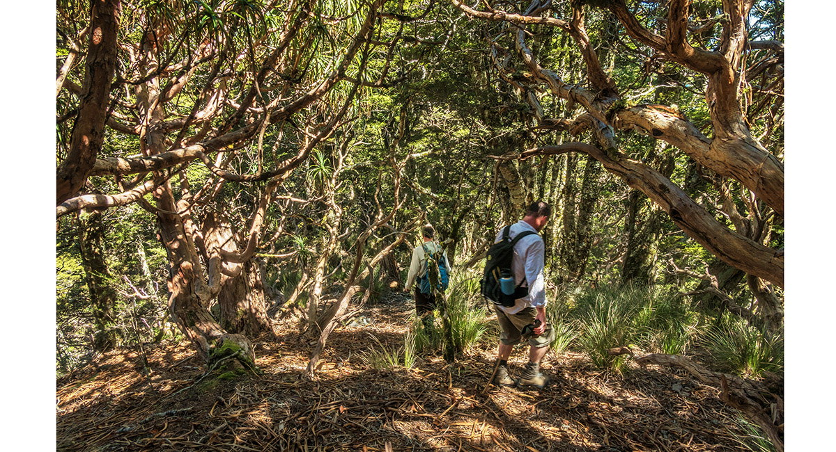 Passing through ancient dracophyllum on the saddle. This route was surprisingly easy until the last section that significantly narrowed and steepend up