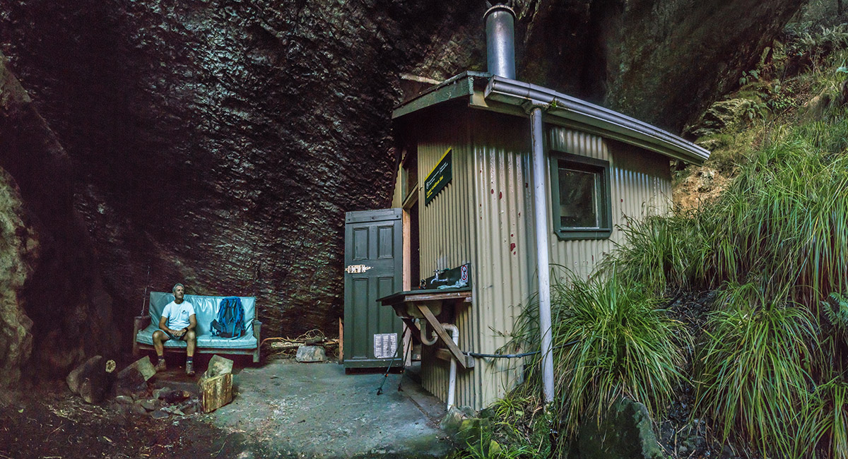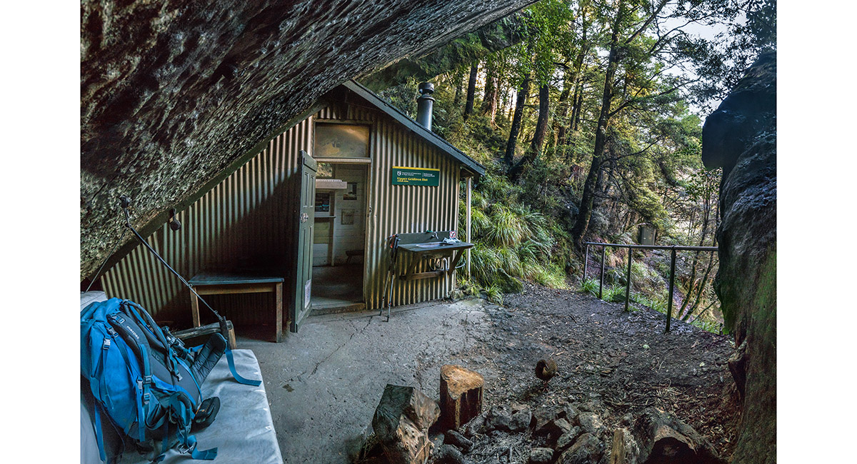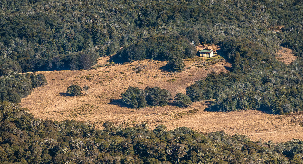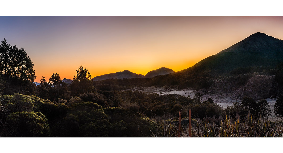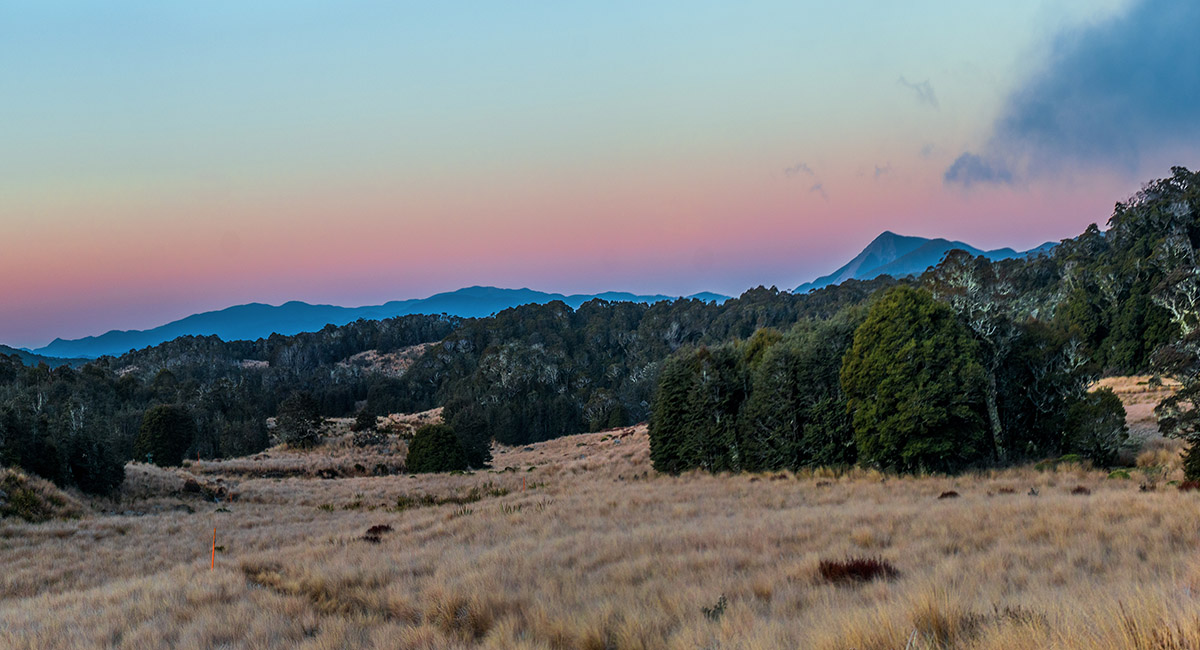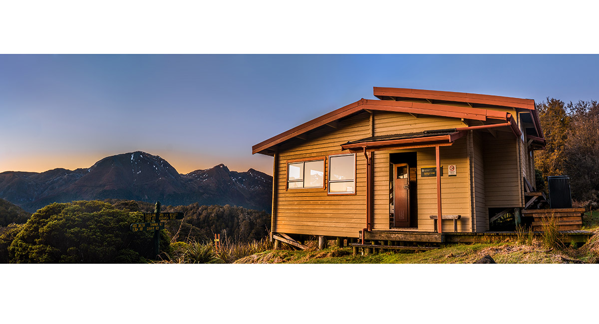 Salisbury Lodge (1,060m) at dawn, with Mt Arthur behind
