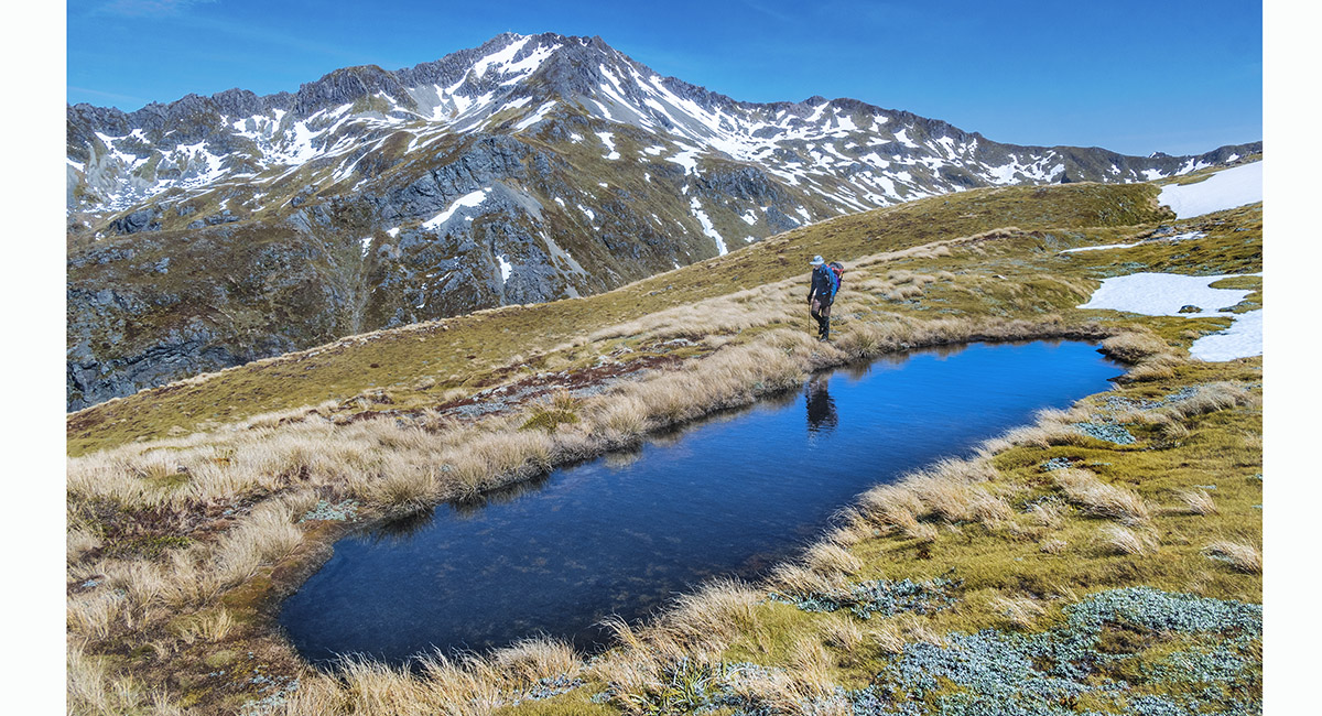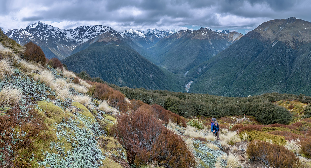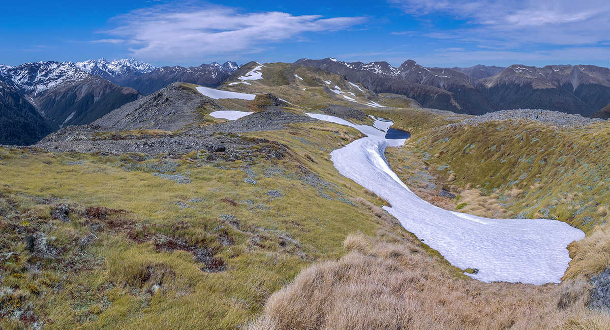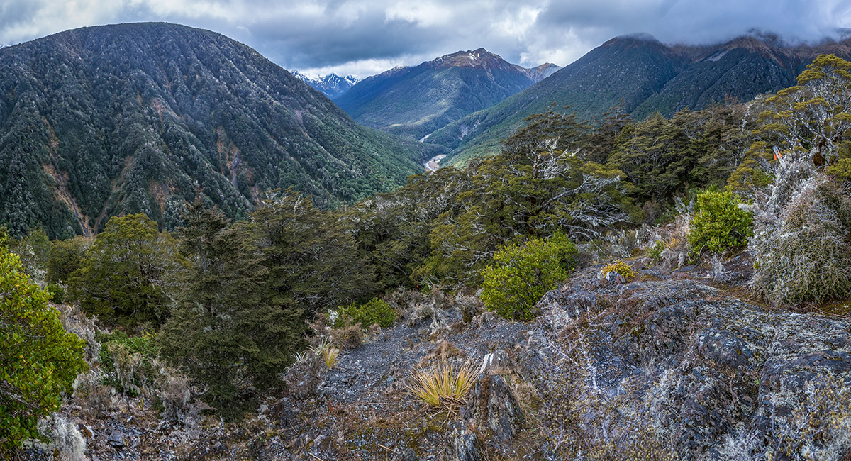 A view west along the Lewis Tops Track, with Maruia River valley at right, The Apprentice (1,678m) centre and Mt Technical (1,870m) left, with Mt Mueller (1,630m) at the western end of Freyberg Range at right