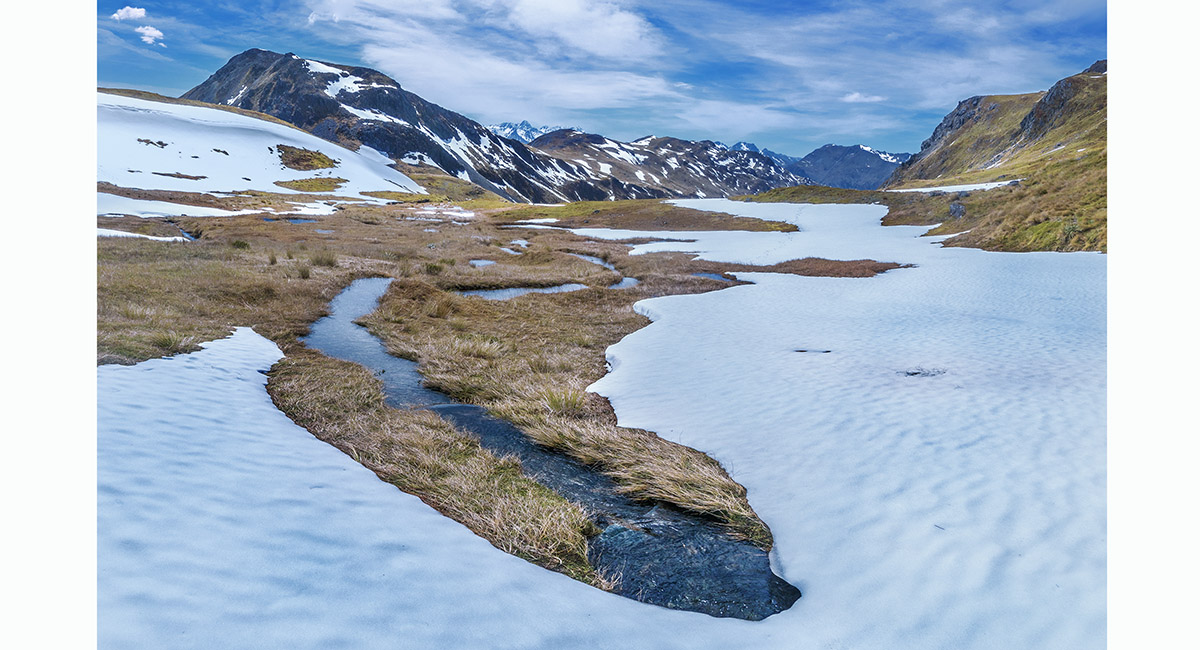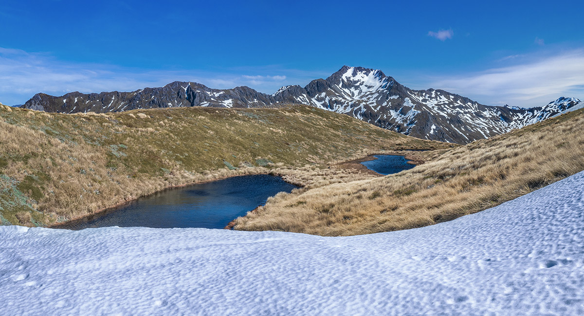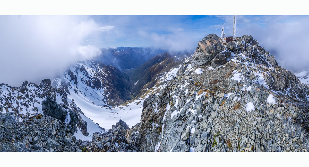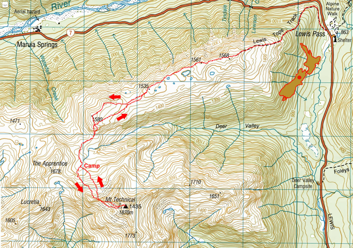 A view west along the Lewis Tops Track, with Maruia River valley at right, The Apprentice (1,678m) centre and Mt Technical (1,870m) left, with Mt Mueller (1,630m) at the western end of Freyberg Range at right