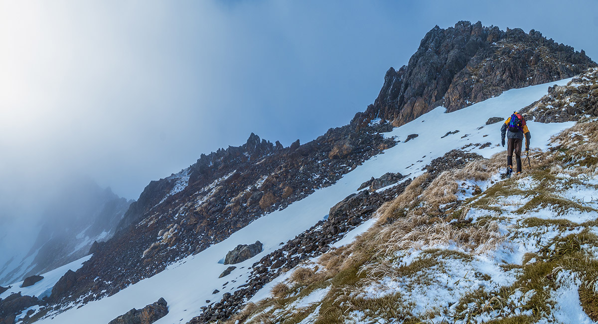 At about 1,750m, climbing hard frozen snow beneath the summit on the southwest face
