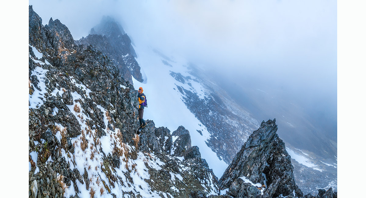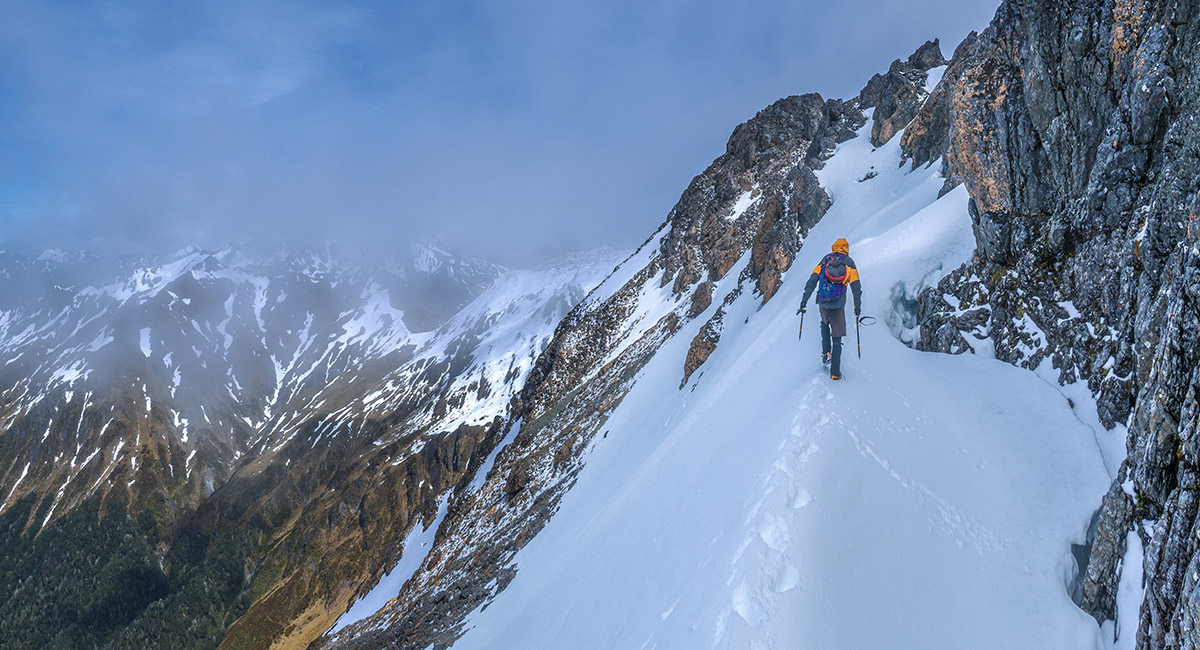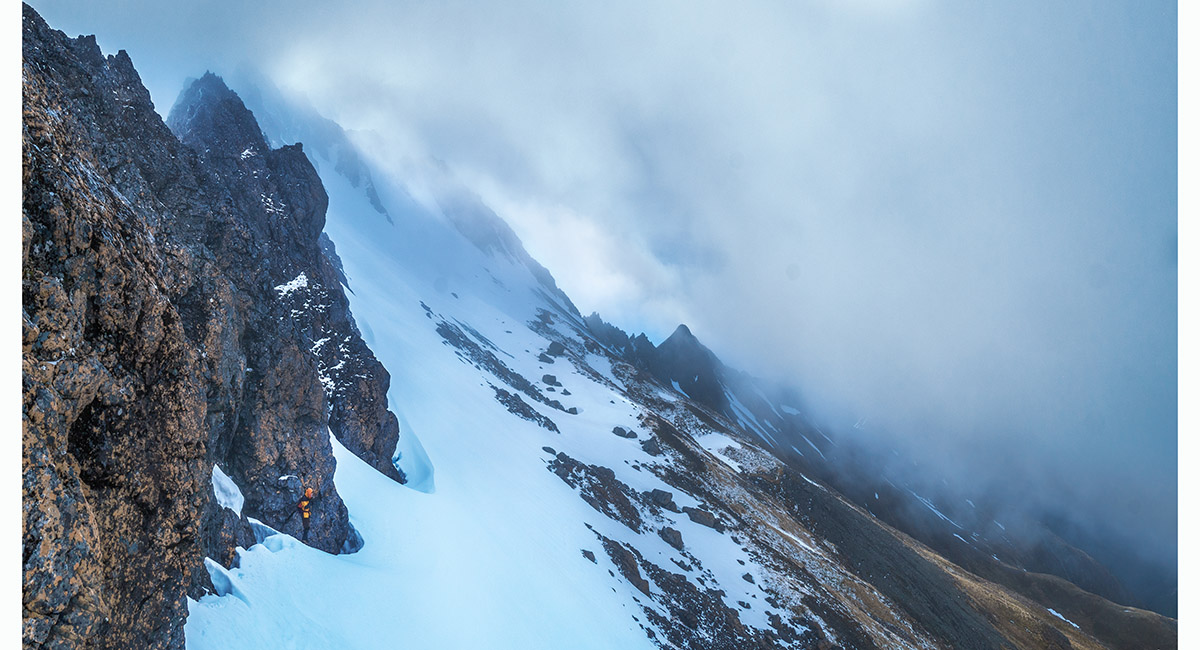 Climbing the northwest face, nearing the west ridge crossing point at 1,700m