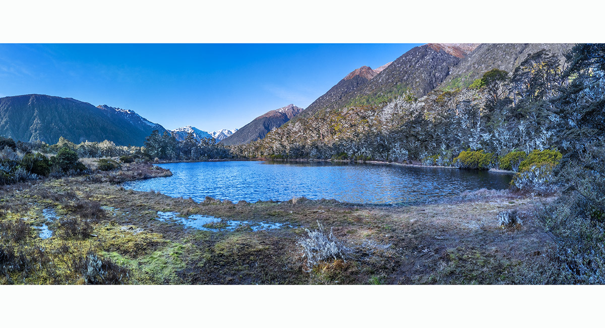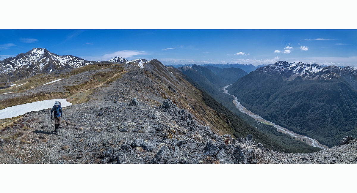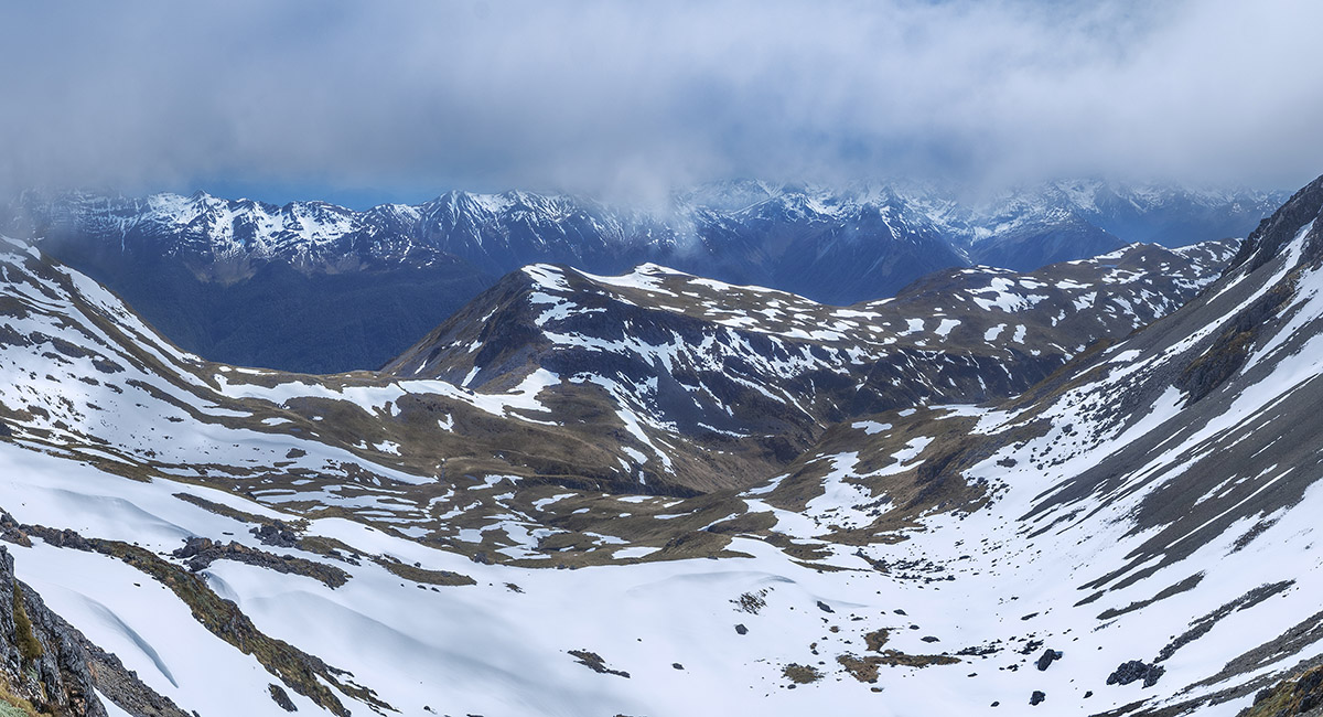 A view north from the west ridge crossing point. Our camp site is just out of view centre left and Freyberg Range is in the distance