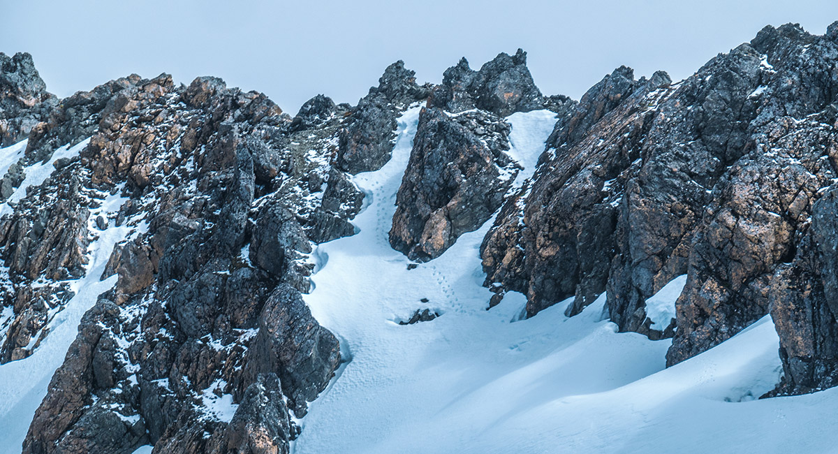 At about 1,750m, climbing hard frozen snow beneath the summit on the southwest face. Lucretia Stream behind