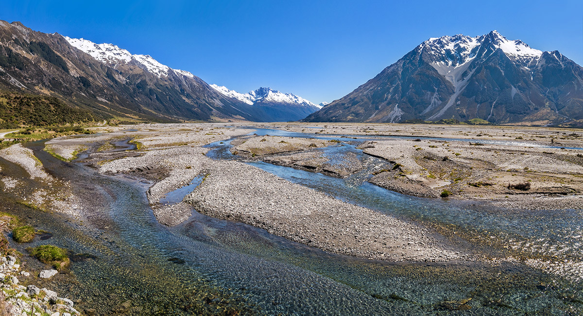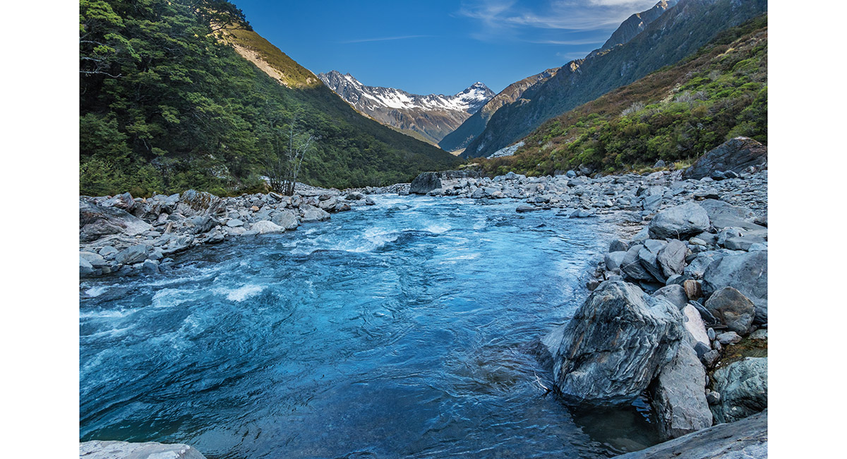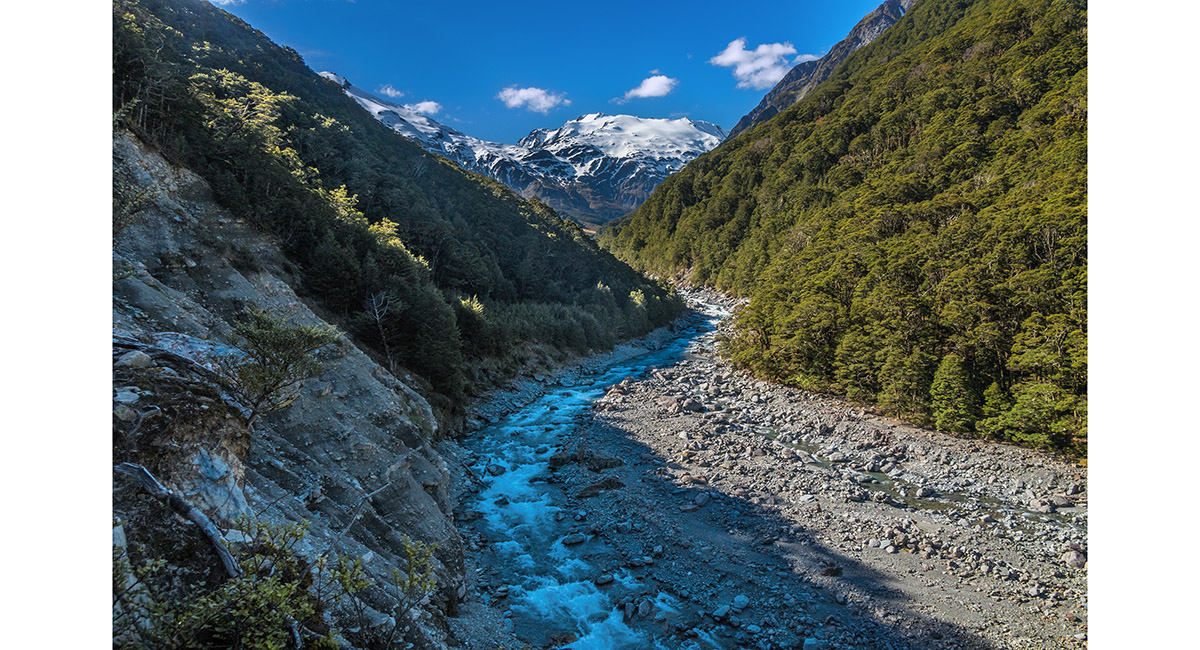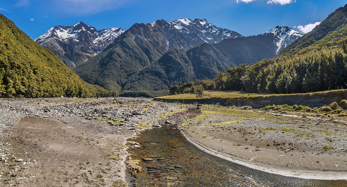 Looking west up Huxley River, nearing Main Huxley Forks Huts