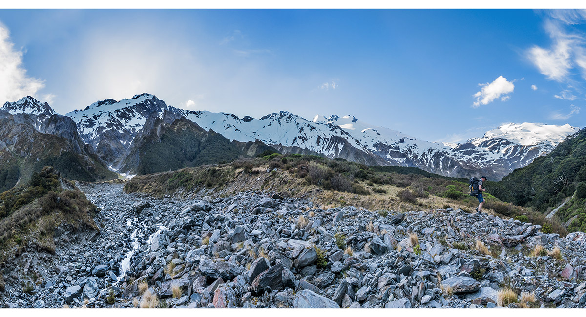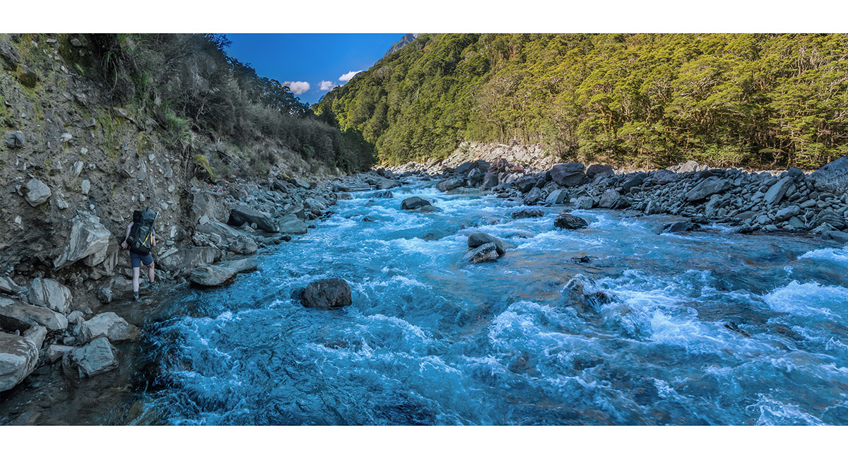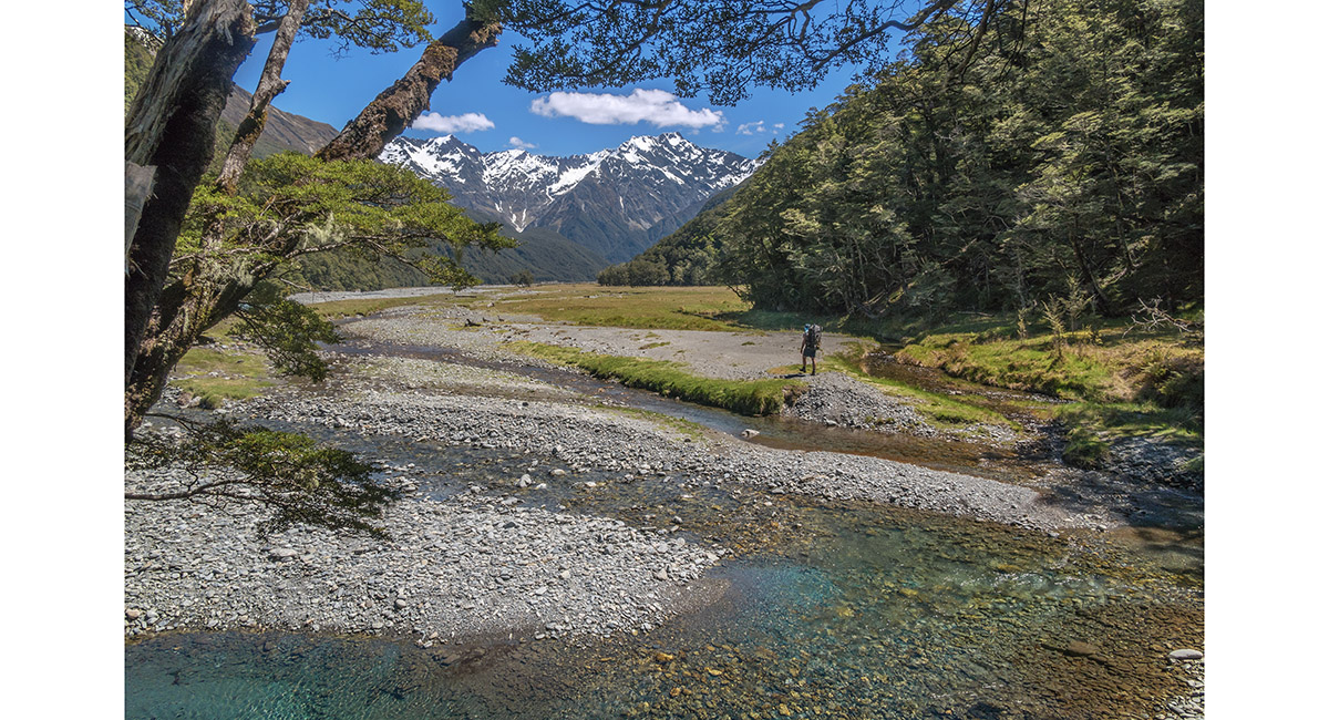 Departing Huxley River North Branch to climb to Brodrick Hut. Brodrick Pass is in the dip far right