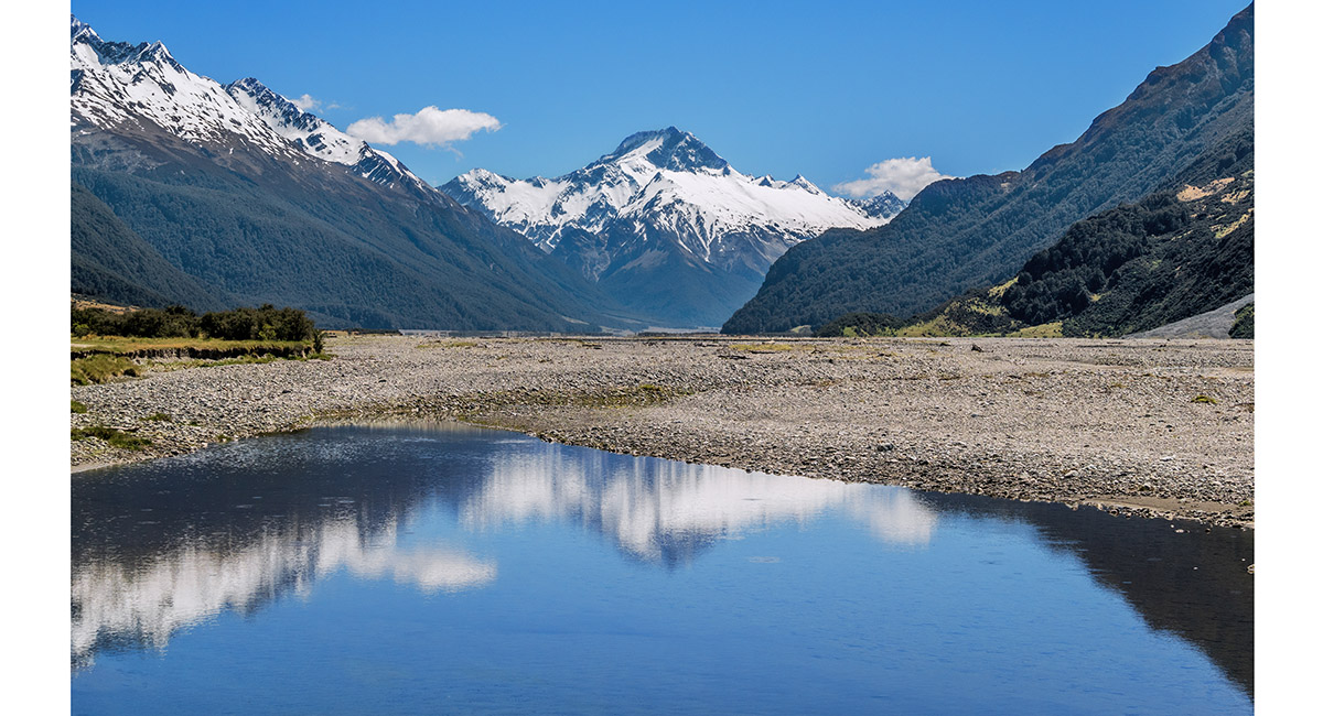 Looking west up Huxley River. Anita Peak (2,380m) centre