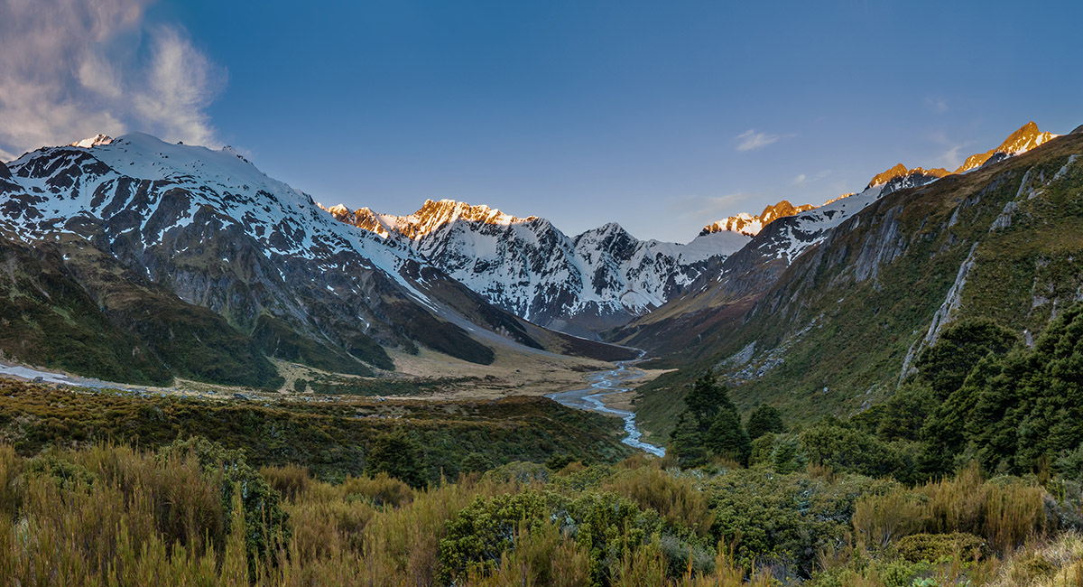 Dusk view to the head of Huxley River North Branch from the helipad near Brodrick Hut