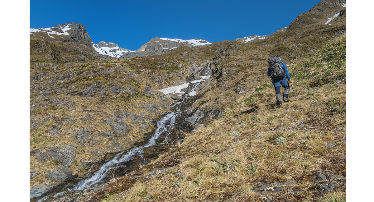 Climbing a steep stream gut, after we failed to locate the beginning of the poled route through dense scrub to Brodrick Pass