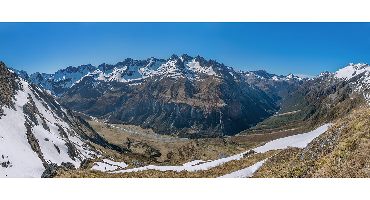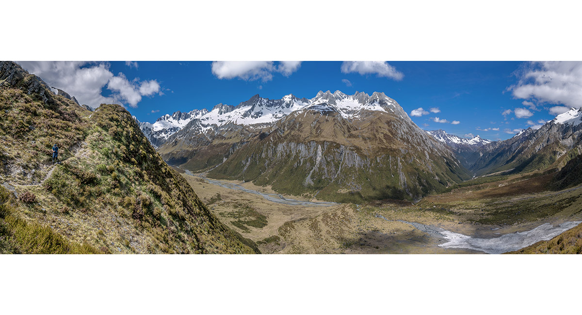 On Brodrick Pass (1,640m), with Mt Strauchon (2,391m) left and Mt Mackenzie (2,156m) right