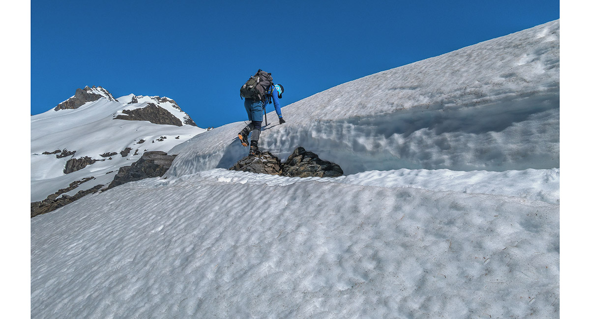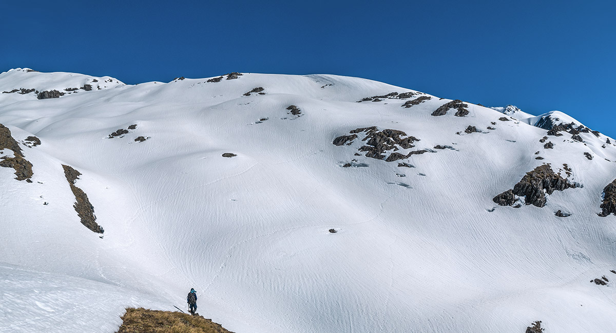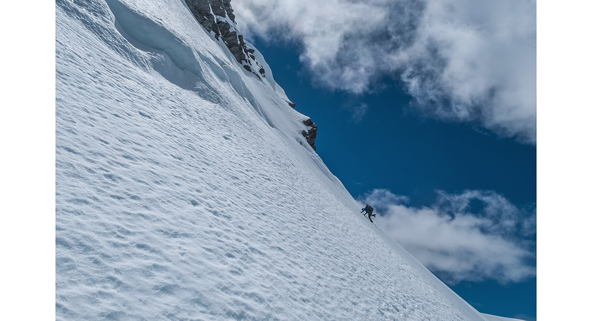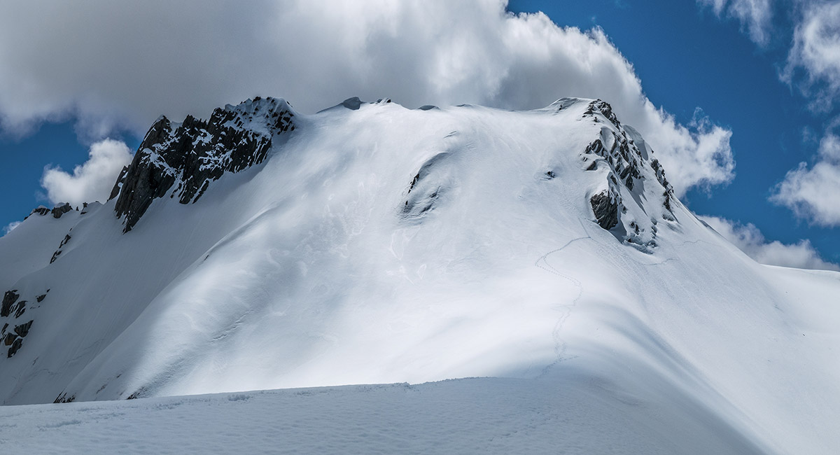 At 2,100m with Mt Mackenzie behind. We had a look at the east side but decided against climbing it due to fresh avalanche debris. Instead we traversed beneath the peak to try the south face