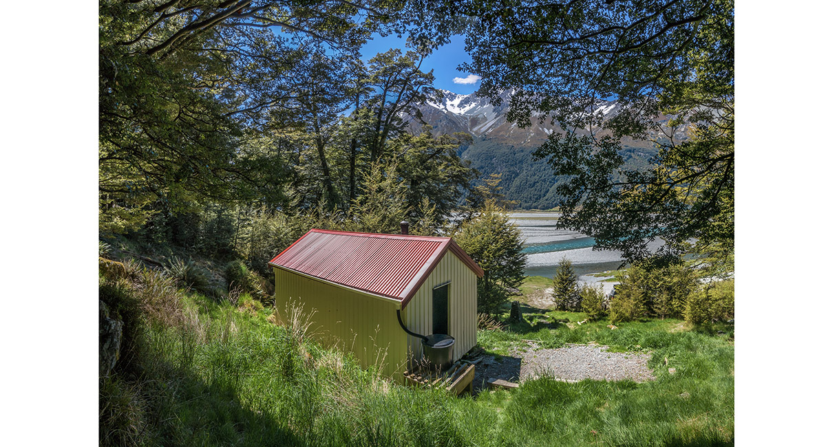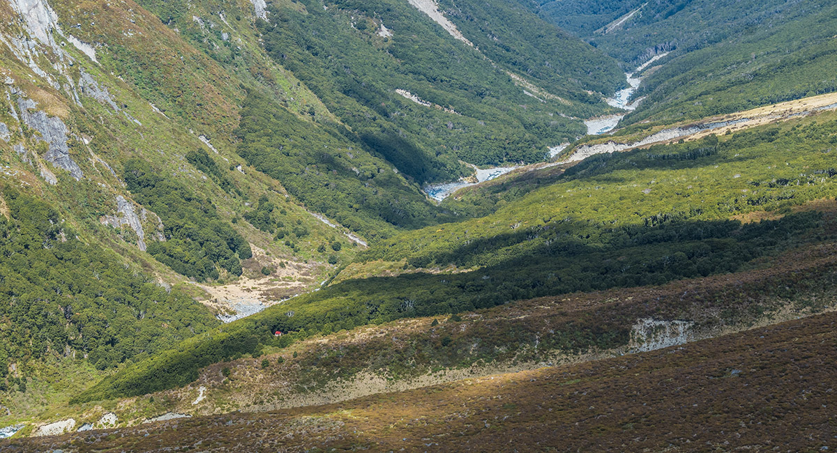 From about 1,200m, looking back down the gut over Brodrick Hut to Huxley valley