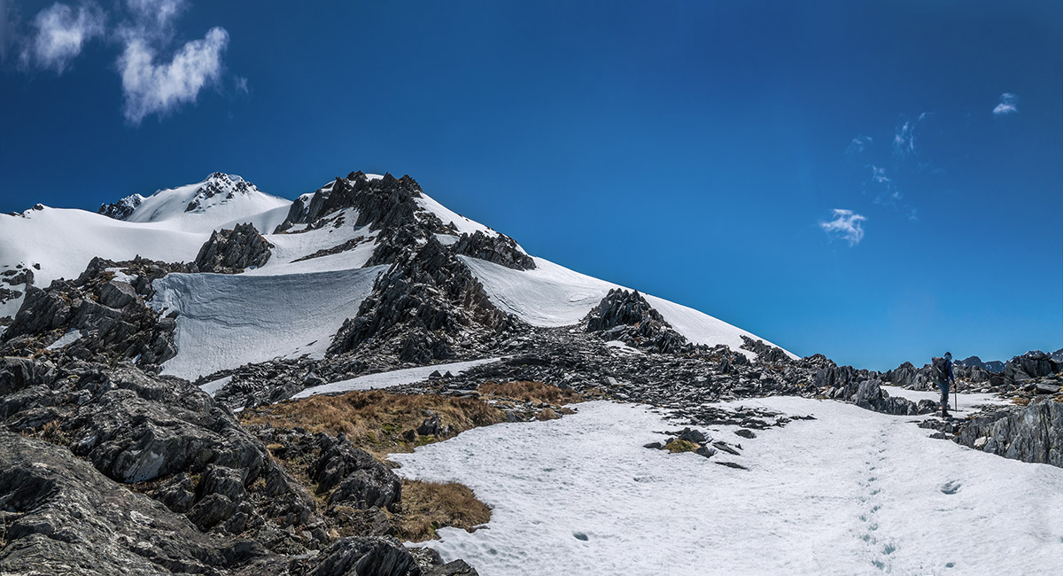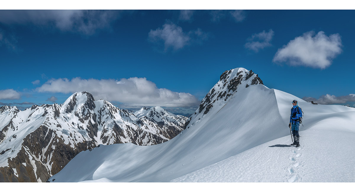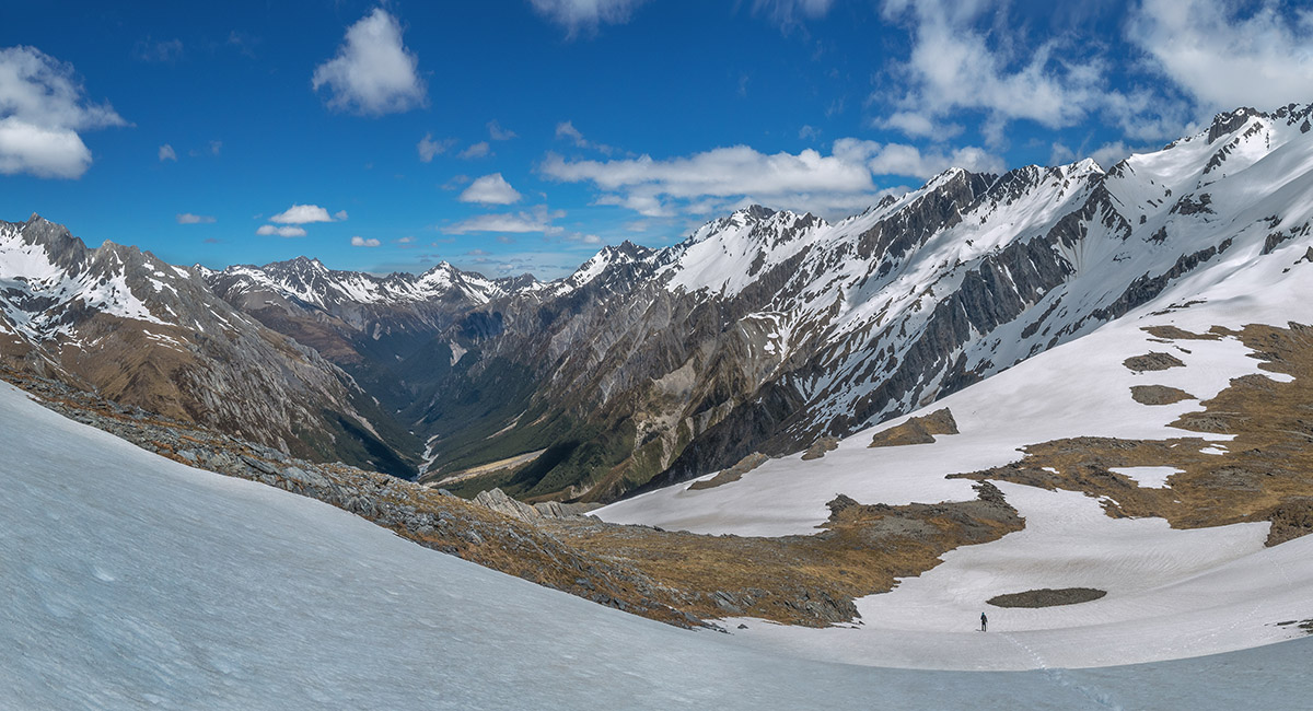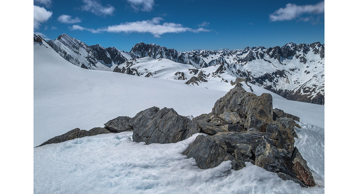 The snow field at 2,050m on the east side of Mt Mackenzie, looking north east to Mt Fraser (2,277m) and other peaks