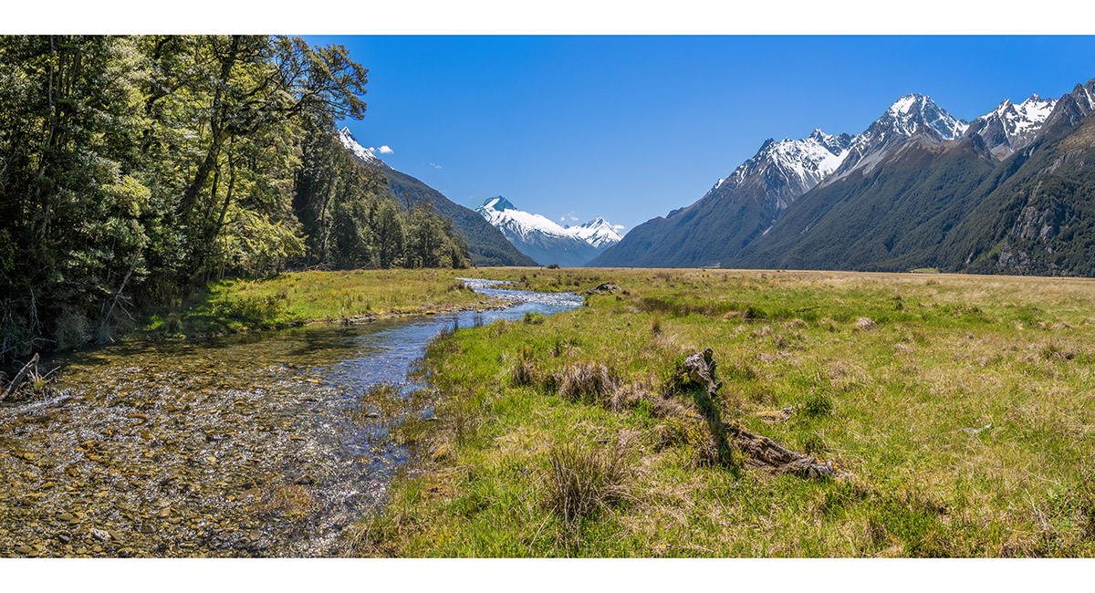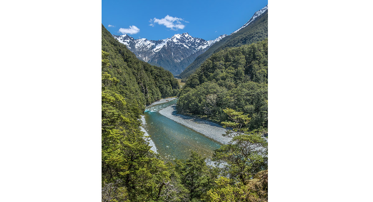 Looking east back down Huxley River to the Naumann Range, from near Main Huxley Forks Huts