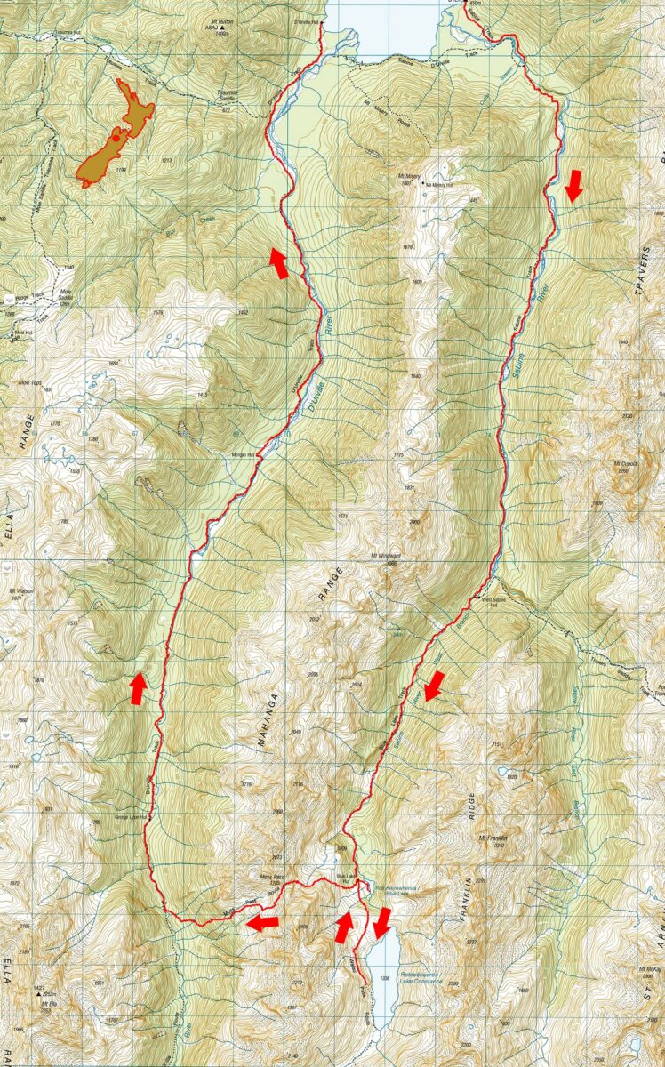 Another view of the 1,600m tarn, with the Ella Range left/west and Mahanga Range right/north. Moss Pass is far right