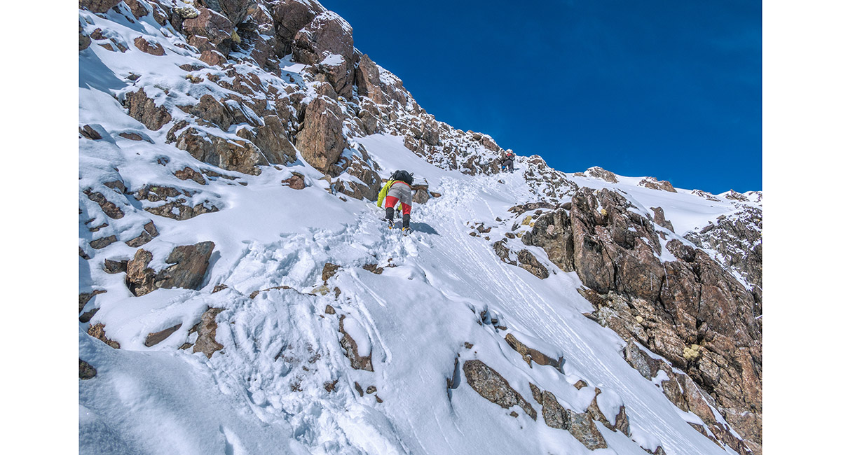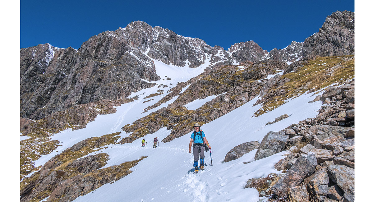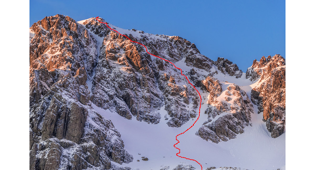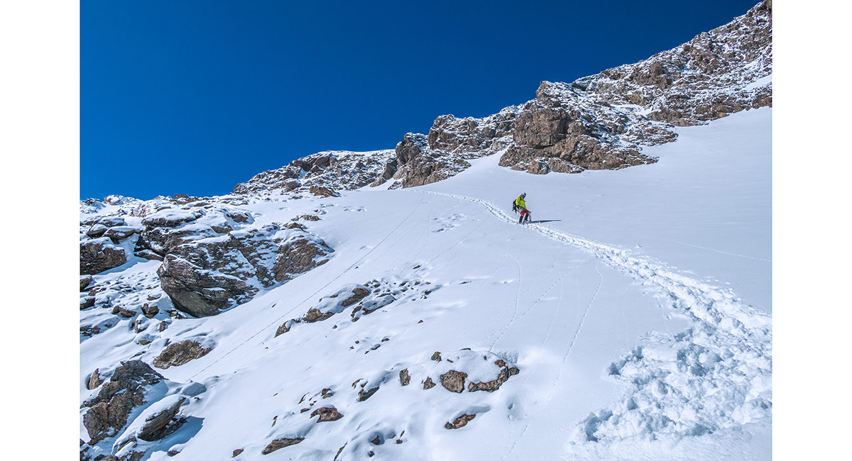 Approaching the entry point to the couloir on Mt Cupola's north face, about 1,900 metres
