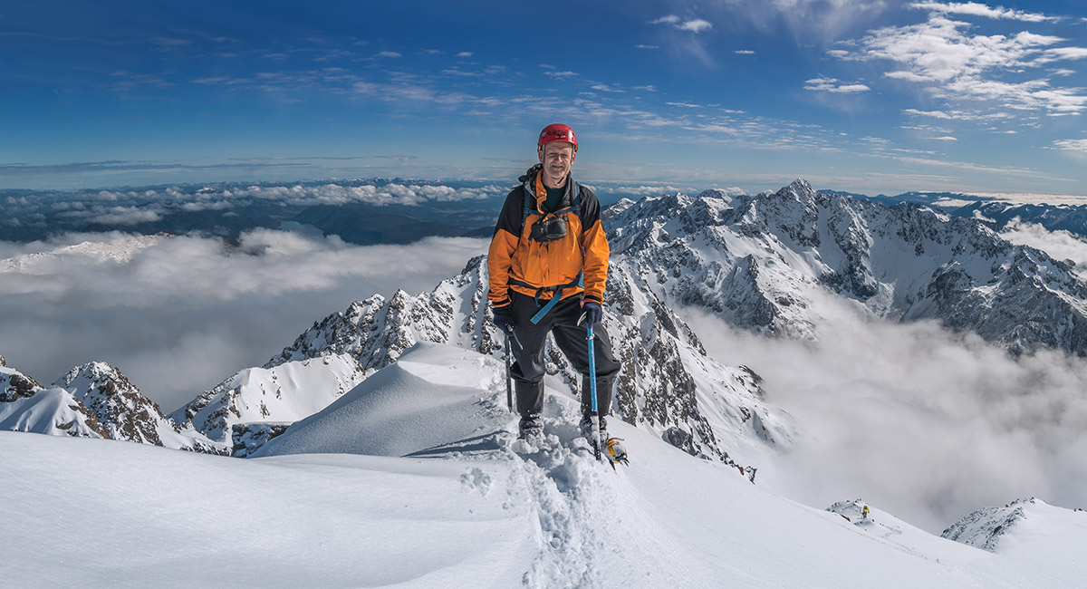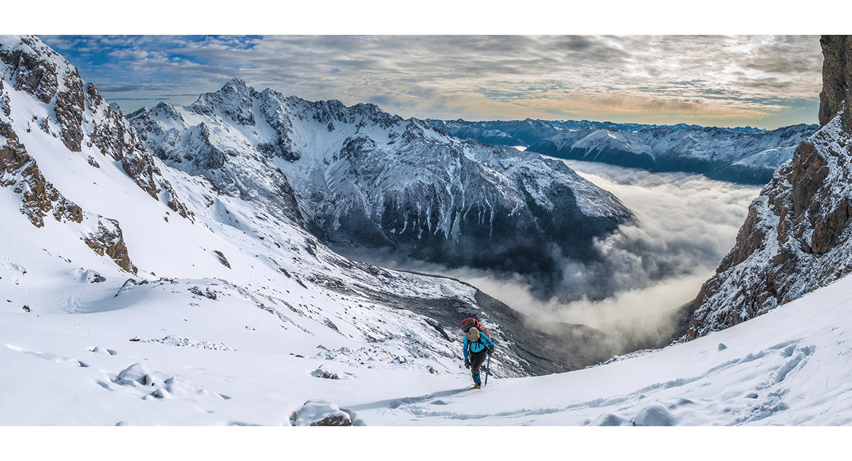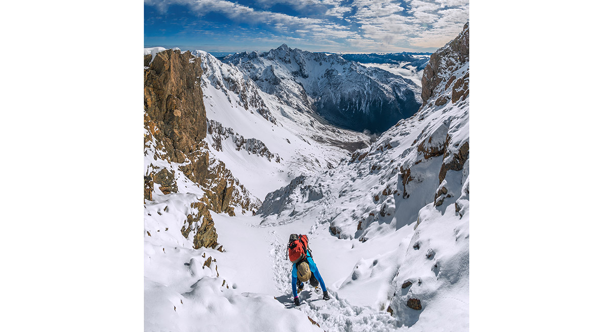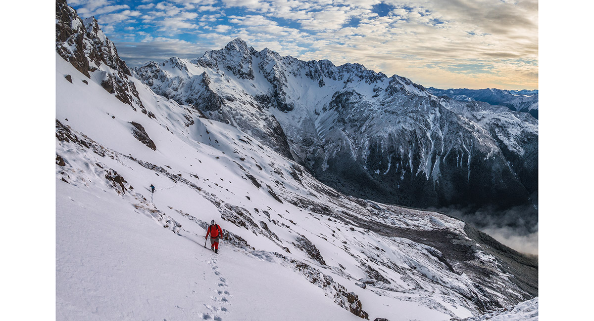 Approaching the entry point to the couloir on Mt Cupola's north face, about 1,900 metres