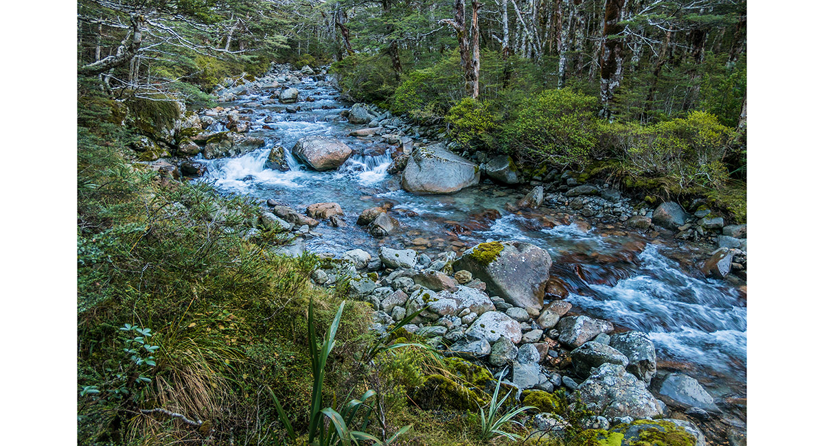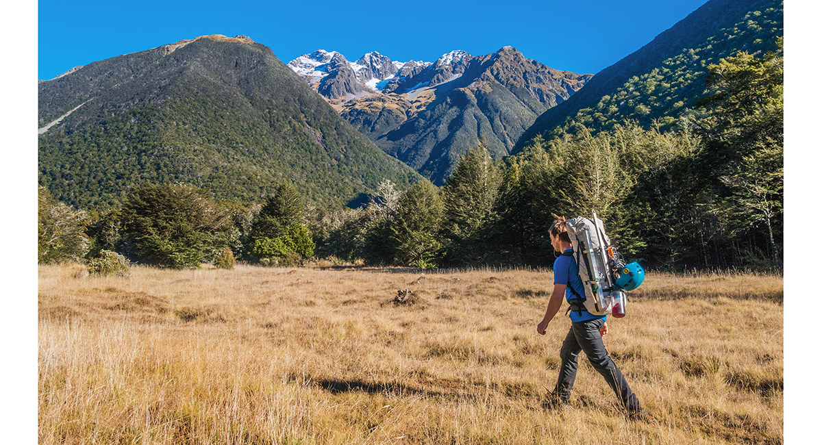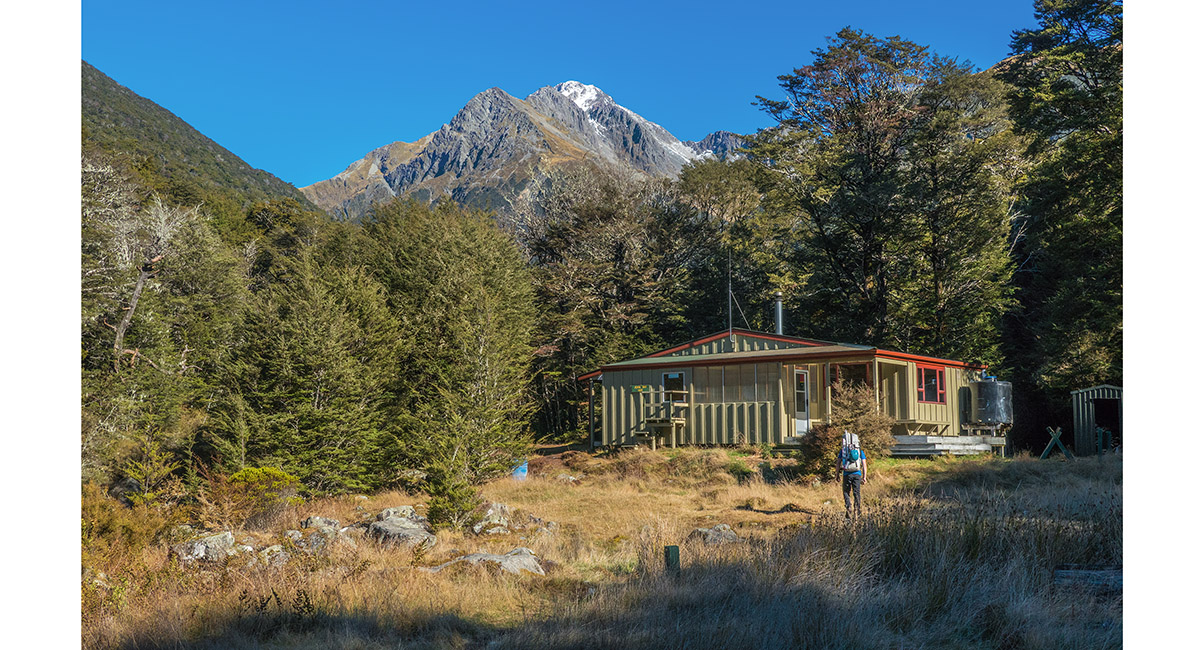John Tait Hut (800m), with Mt Travers (2,338m) behind
