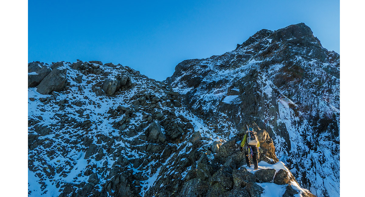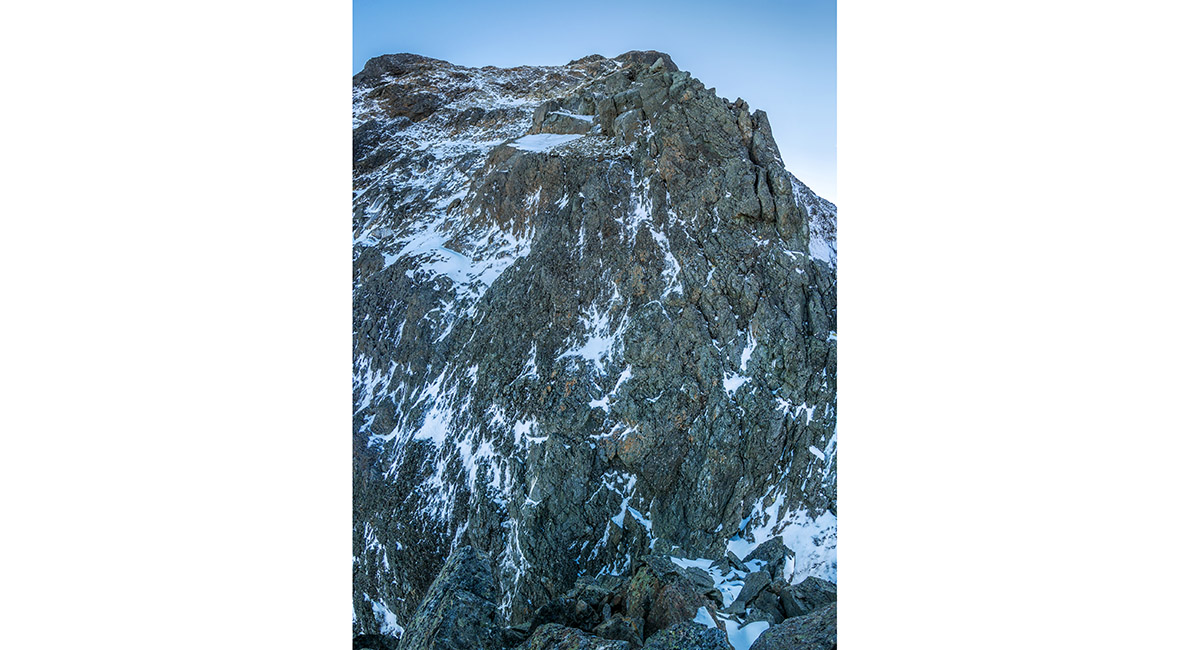 Just off the ridge, not enjoying patchy snow, loose rock and verglass