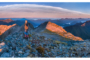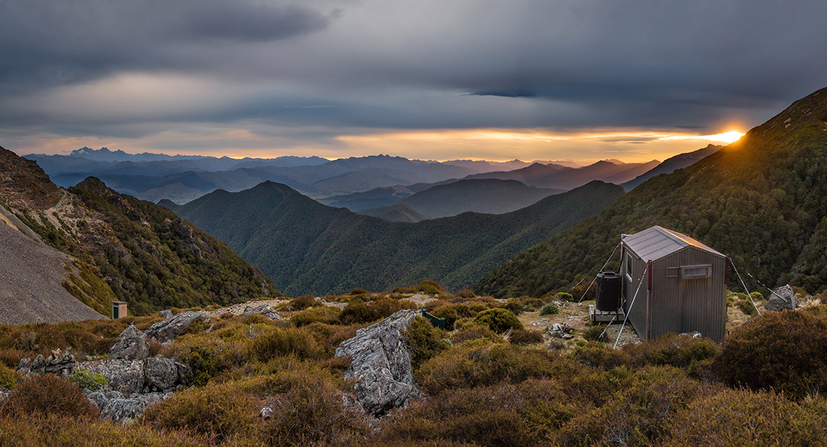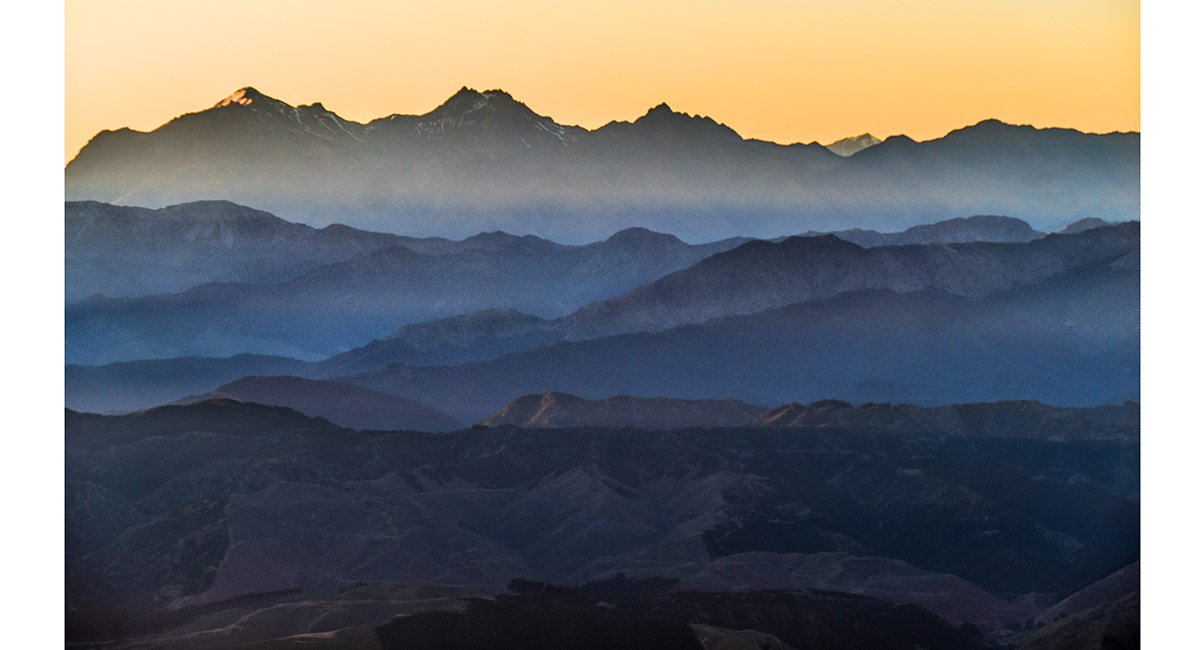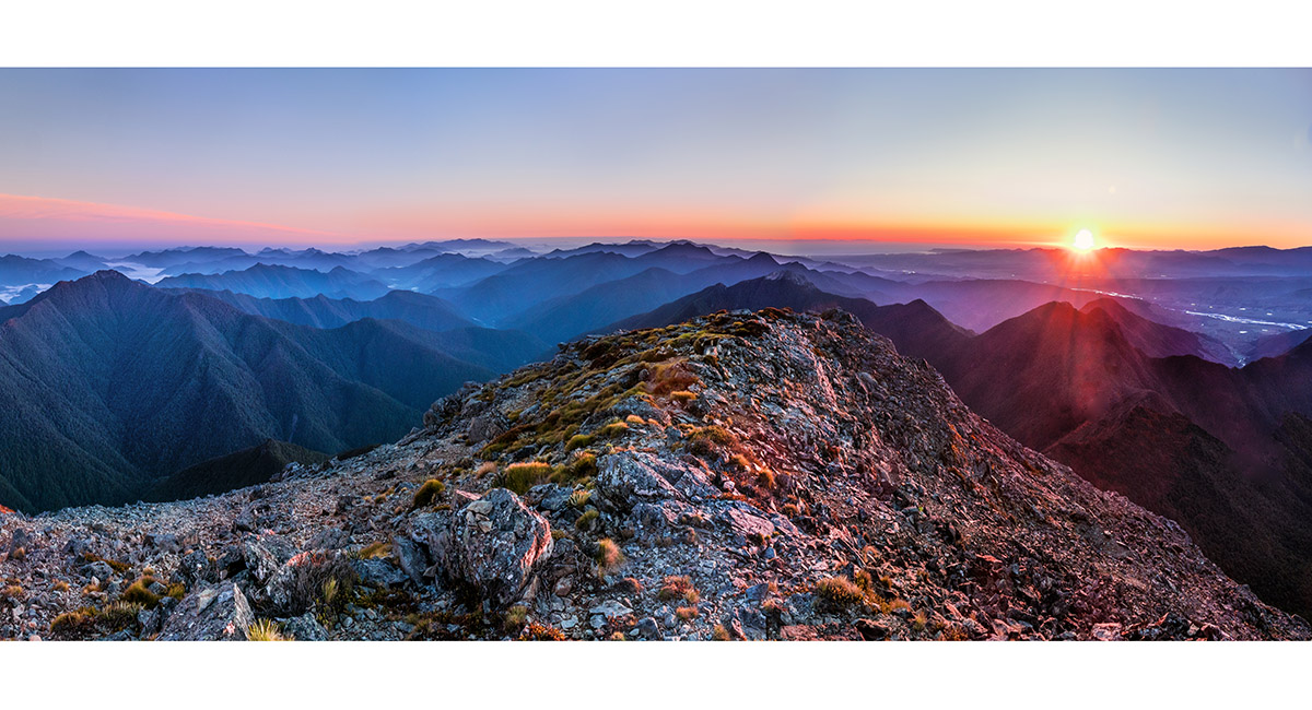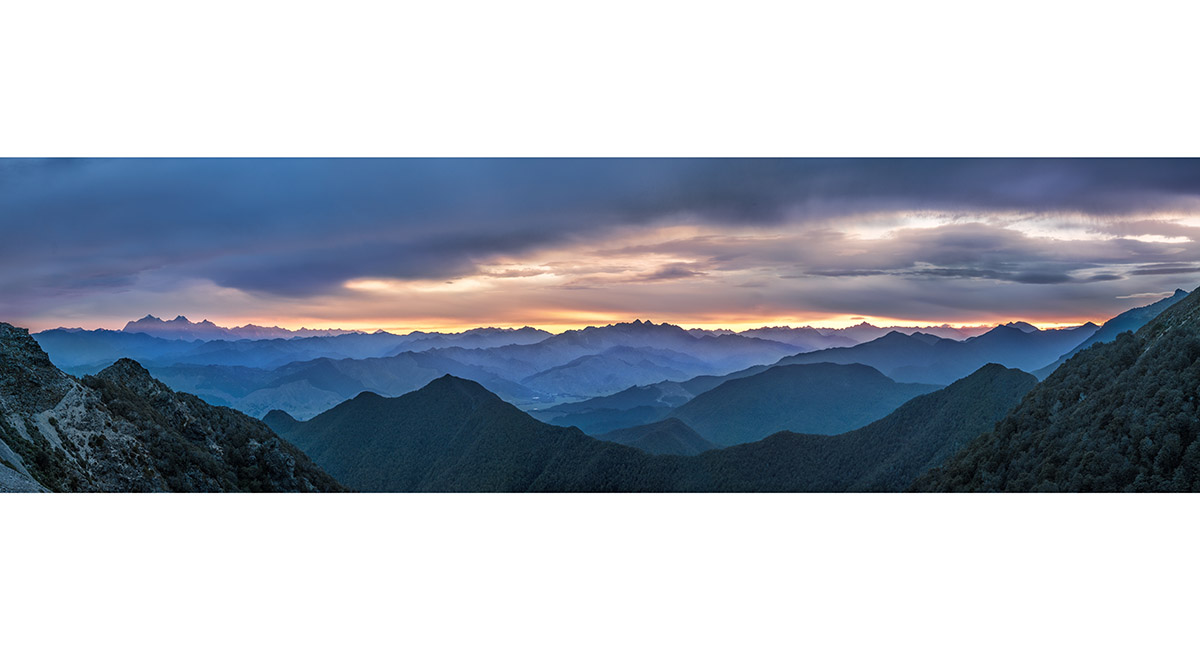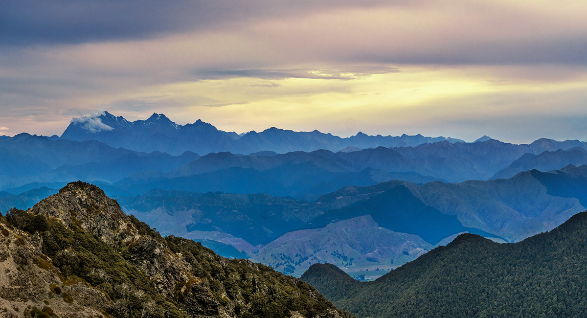 Sunset view south and west from near Fishtail Hut to the inland Kaikoura mountains (left) and the Nelson Lakes mountains (right)