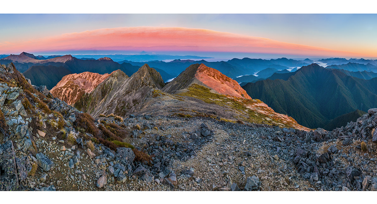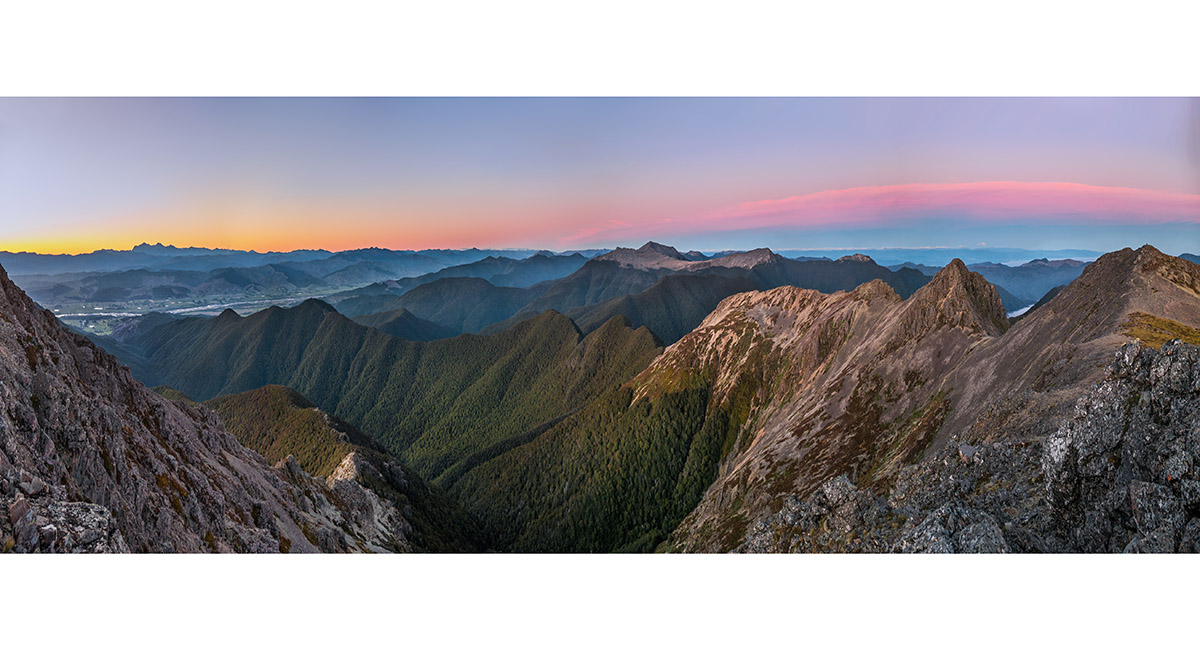 Dawn view south to the inland Kaikoura mountains (left), west to Mt Richmond (centre) and northwest to Mt Fishtail's secondary summit and distant Arthur Range (right)
