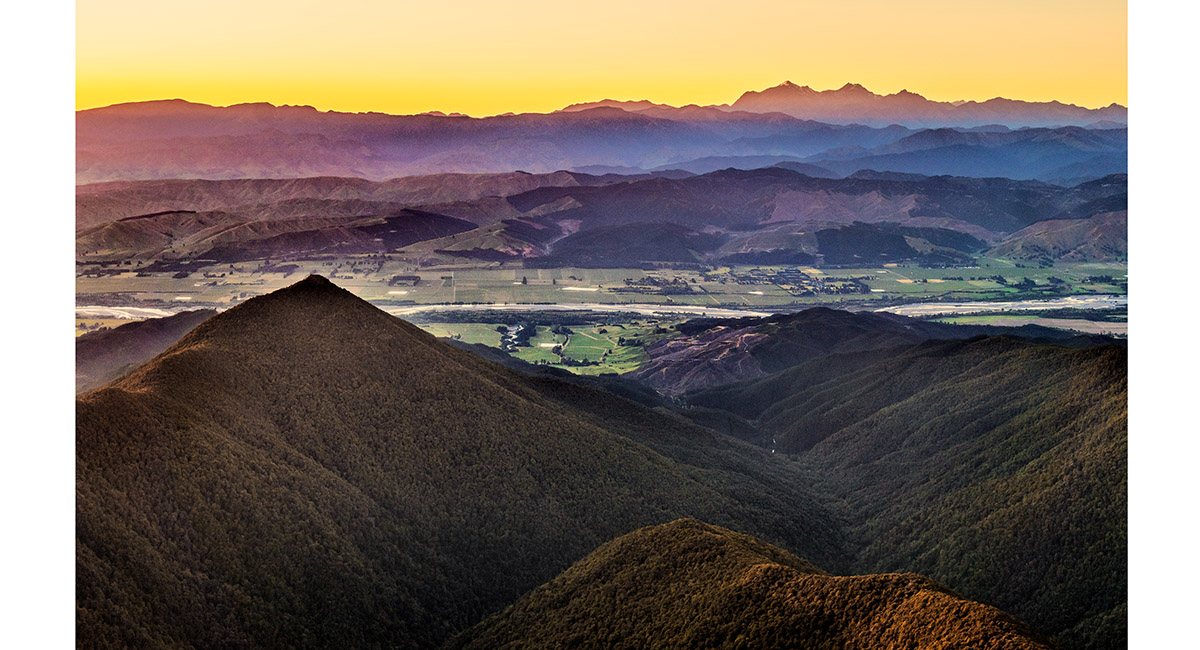 Fishtail summit view at dawn south across Wairau Valley to Tapuae-o-Uenuku