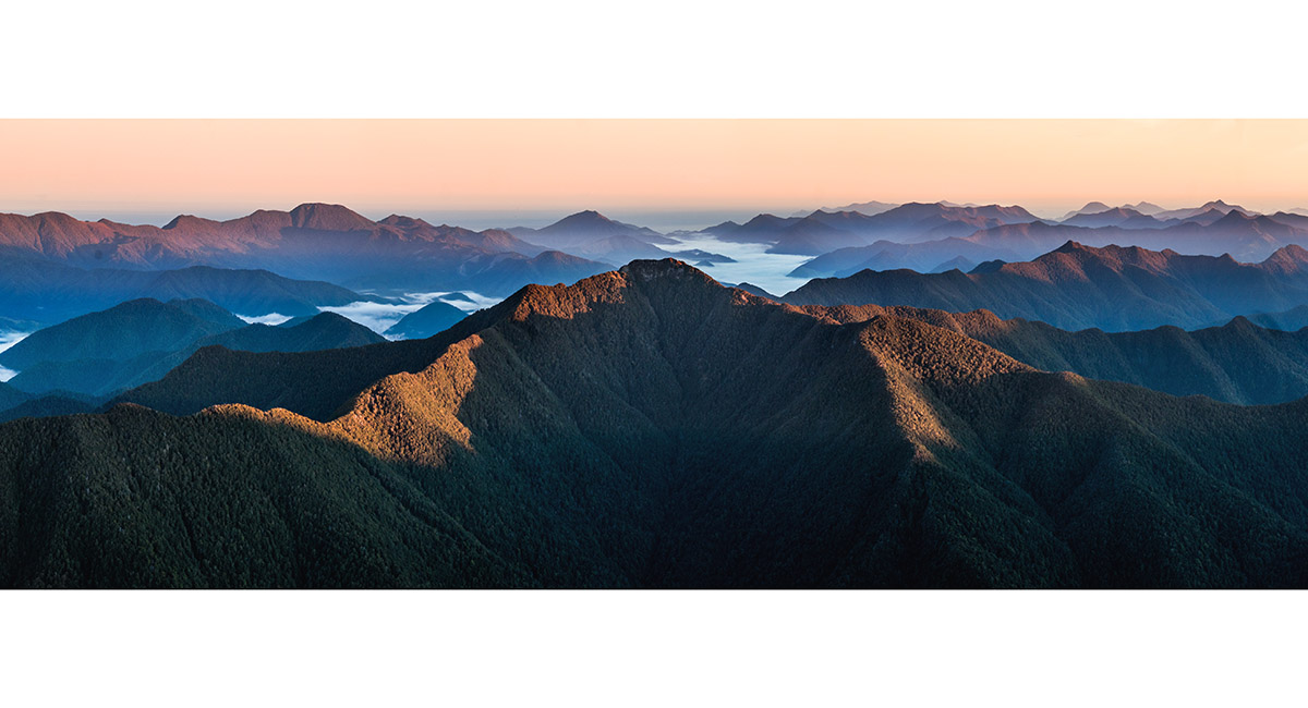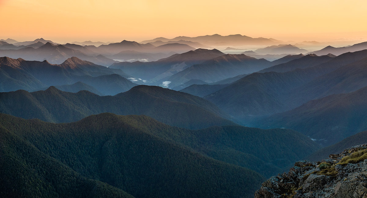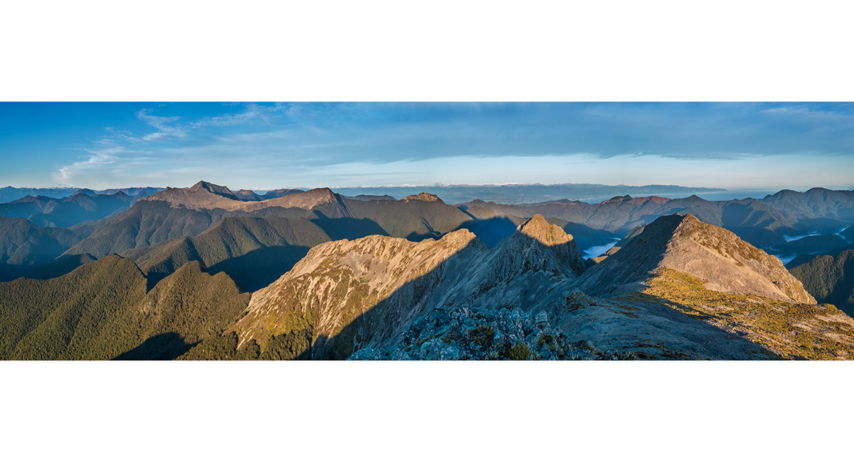 Fishtail summit view at dawn west to Mt Richmond and Mt Fell (left), northwest to Mt Fishtail's secondary summit and distant Arthur Range (centre), and north along the Richmond Range
