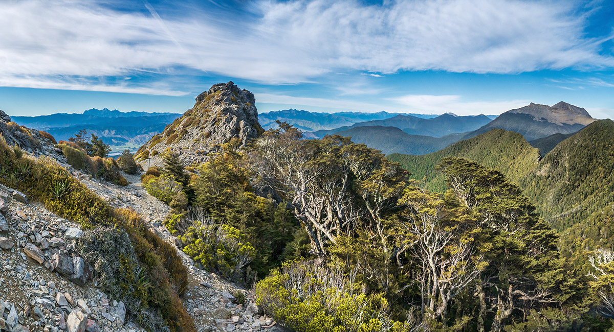 A view south from the trail before it heads back into the bush at about 1,300m. Tapuae-o-Uenuku left, Johnston Peak and Mt Richmond right