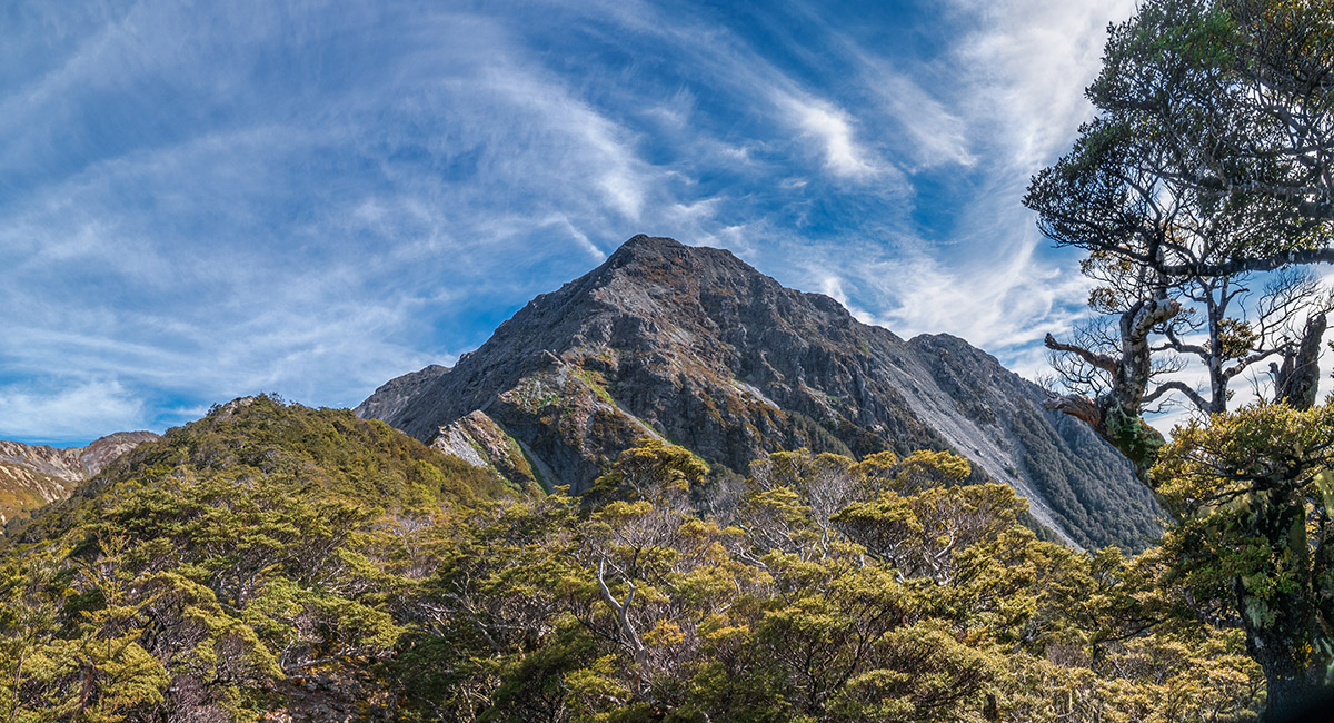 A view over the 1,600m secondary summit of Mt Fishtail to the main summit (1,641m, left)