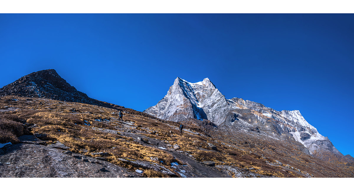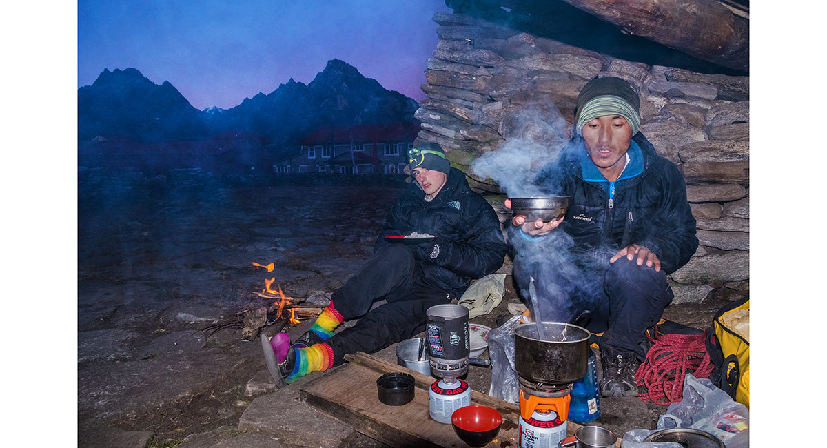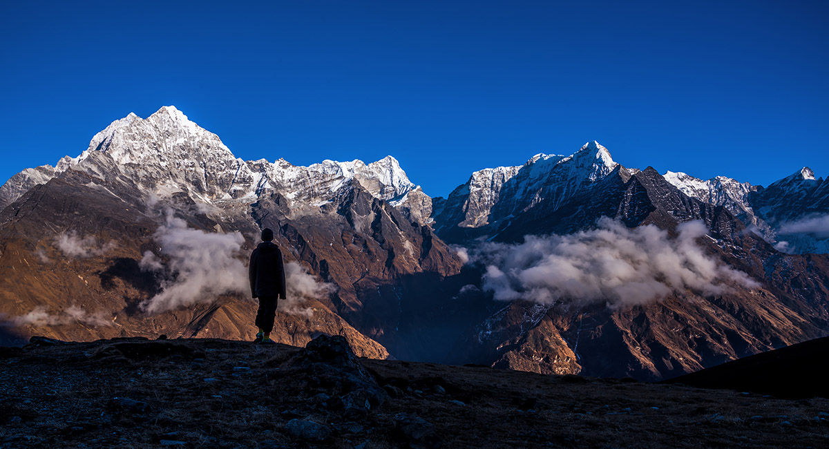 Climbing above Kongde in search of Kongde Lake. Kwangde looms above