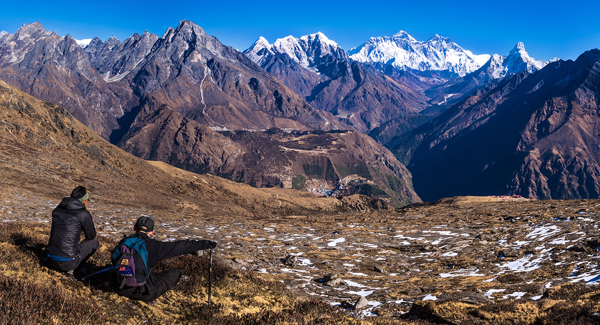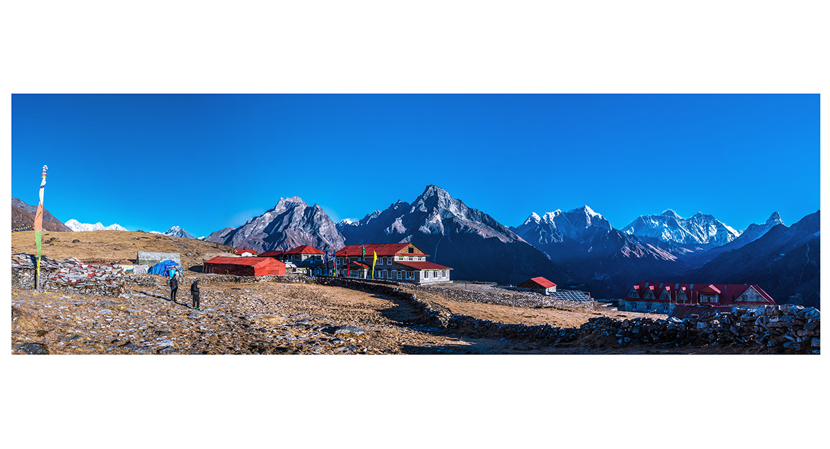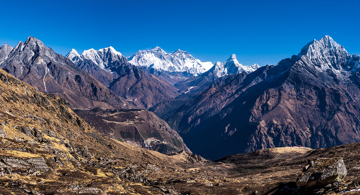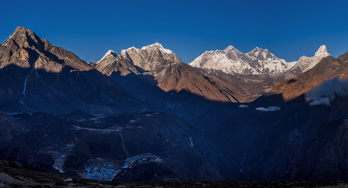 Khumbila, Tawoche, Cholatse, the Everest Group, Ama Dablam and Namche Bazaar in the foreground. Khunde and Khumjung can be partly seen beneath Khumbila and Phortse is further off under Cholatse